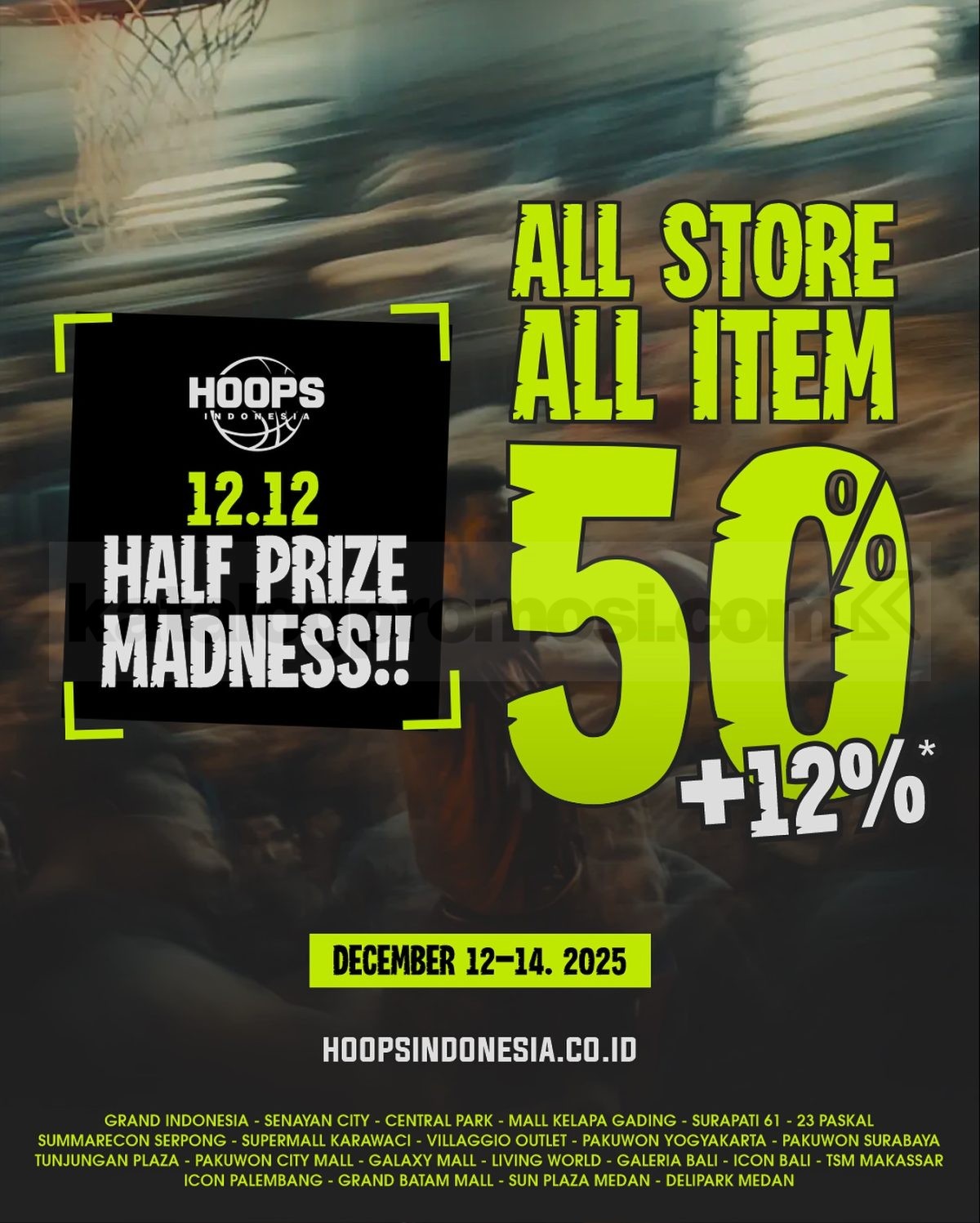 Promo Hoops 12.12 Sale diskon 50% + 12% berlaku 12–14 Desember 2025 di seluruh store dan website Hoops Indonesia untuk berbagai item pilihan.