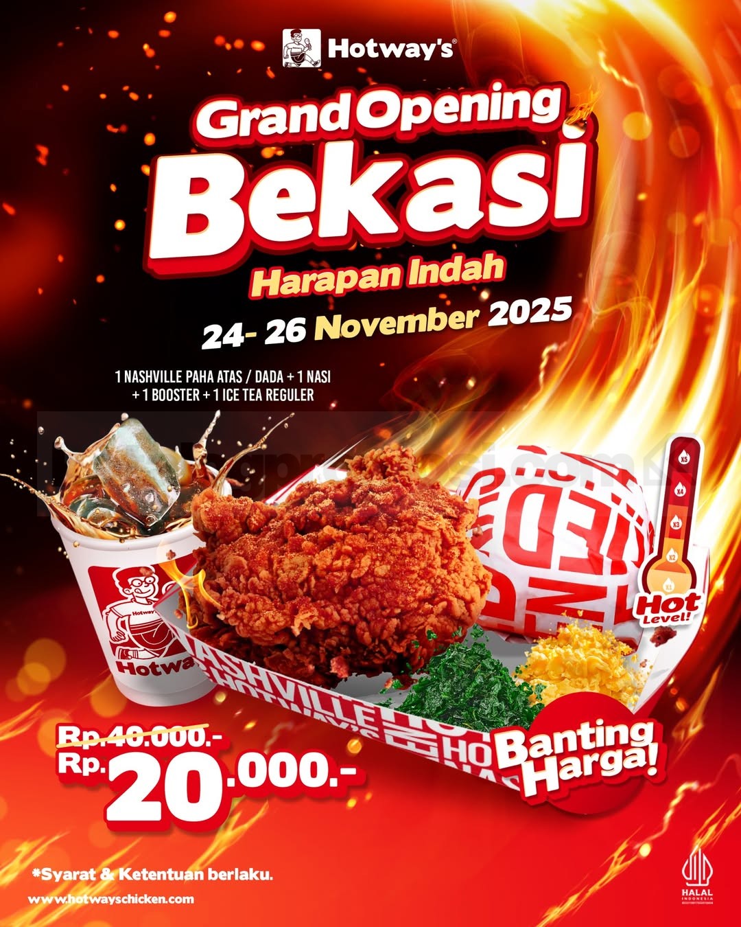 Promo Hotway’s Chicken Bekasi Grand Opening Banting Harga Rp.20.000 untuk paket lengkap, berlaku mulai tanggal 24–26 November 2025 di lokasi Bekasi.