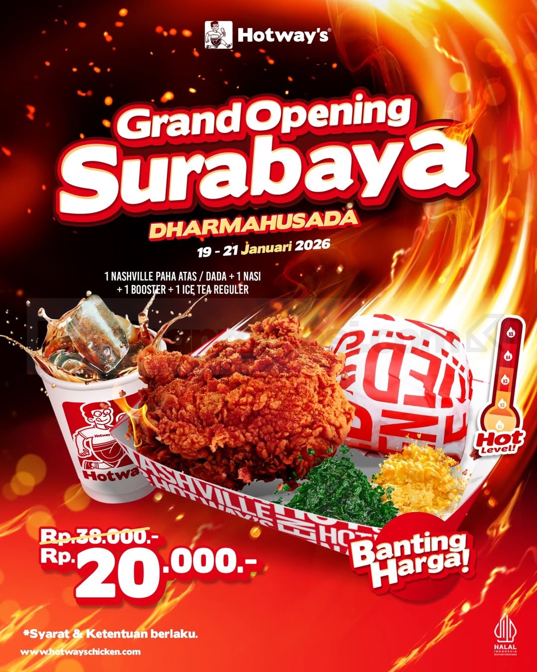 Promo Hotway’s Chicken Grand Opening banting harga Rp.20.000 paket Nashville lengkap, berlaku 19-21 Januari 2026 untuk dine in & take away.