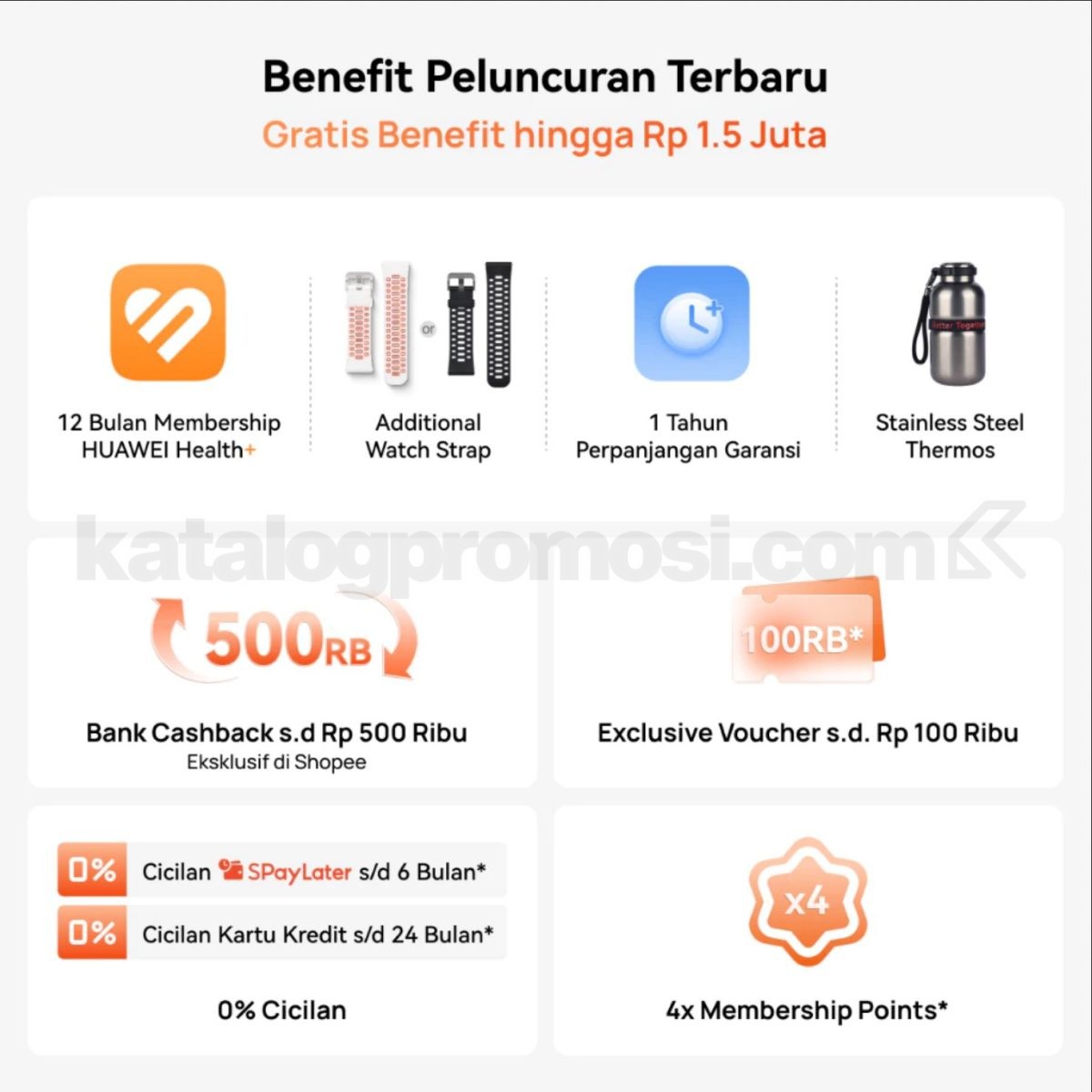Bonus termasuk membership HUAWEI Health+, garansi tambahan, strap, dan thermos premium.