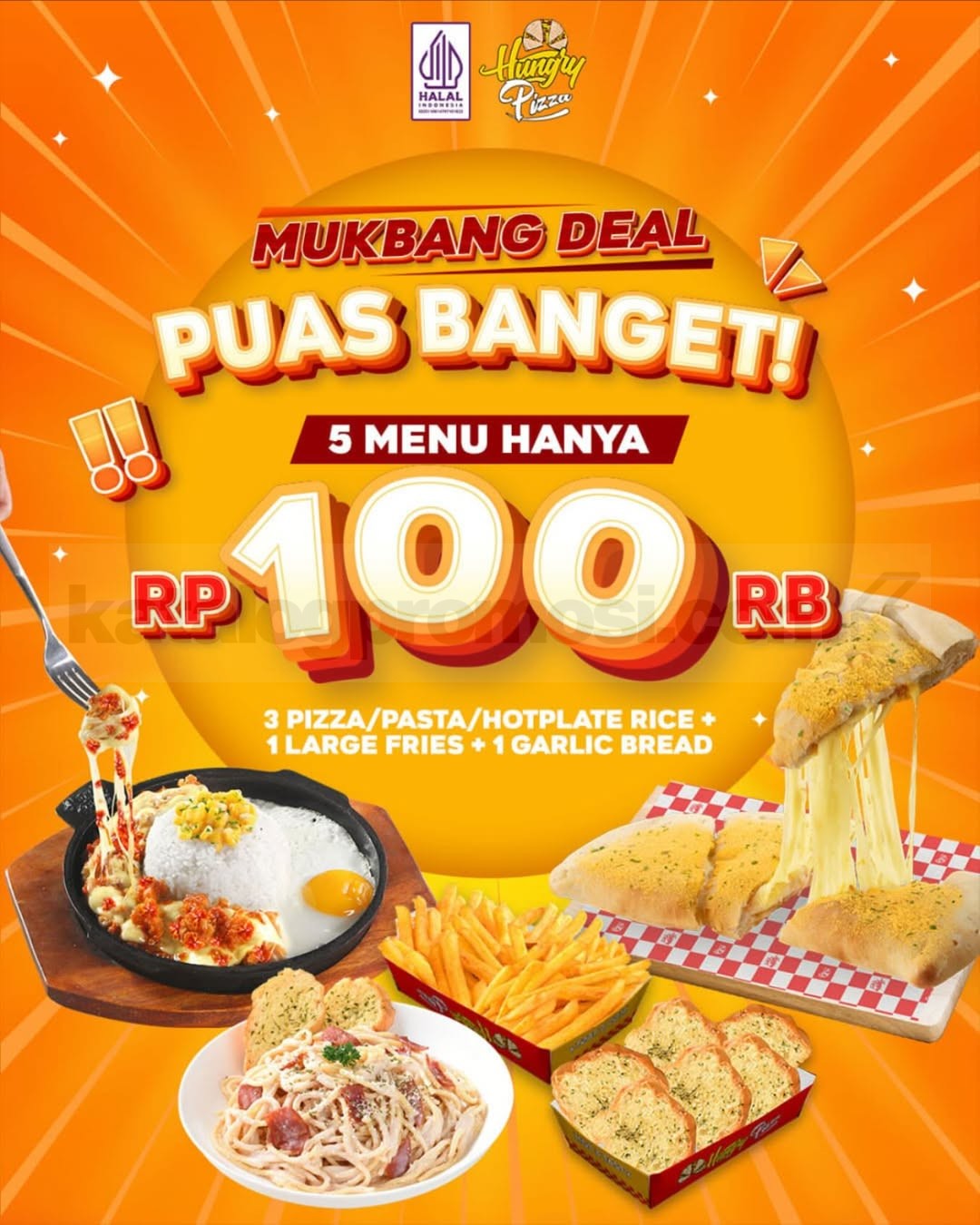👉 Cek gambar Promo Hungry Pizza Mukbang Deal 5 Menu Rp. 100 ribu di bawah ini untuk lihat komposisi menu dan gambaran paketnya lebih jelas.