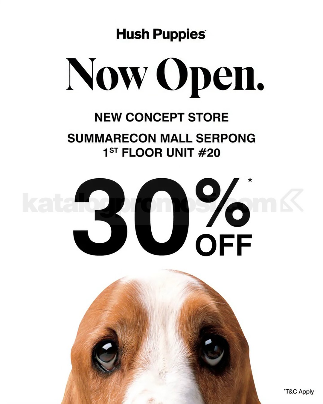 Diskon 30% berlaku untuk setiap pembelian di store Hush Puppies Summarecon Mall Serpong.