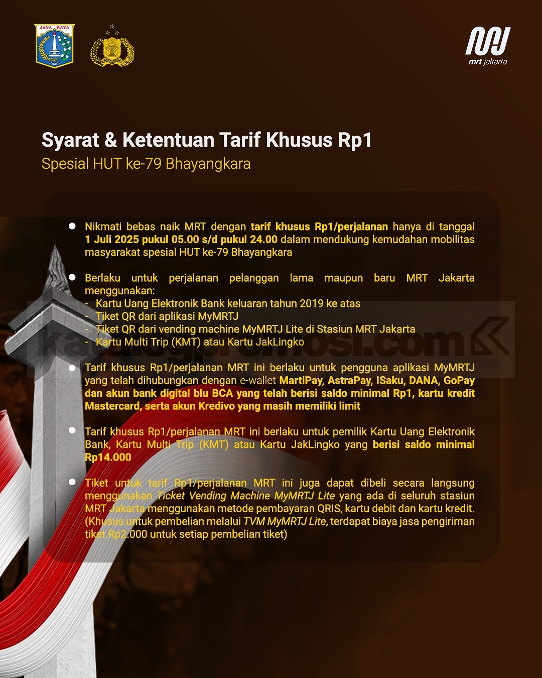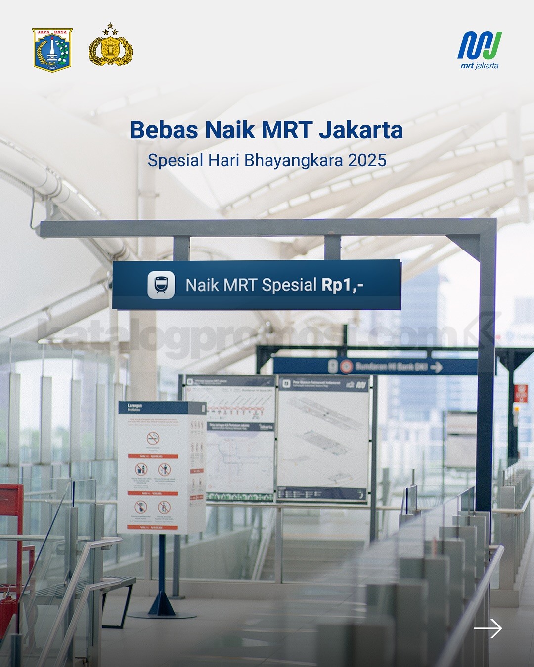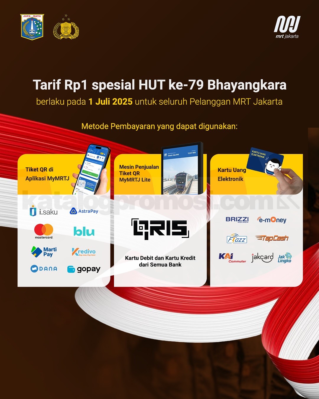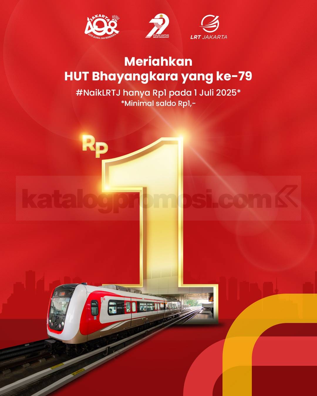 Promo HUT Bhayangkara 2025 Naik MRT, LRT dan TransJakarta cuma Rp1! Bebas keliling Jakarta seharian tanggal 1 Juli 2025, hemat dan praktis.