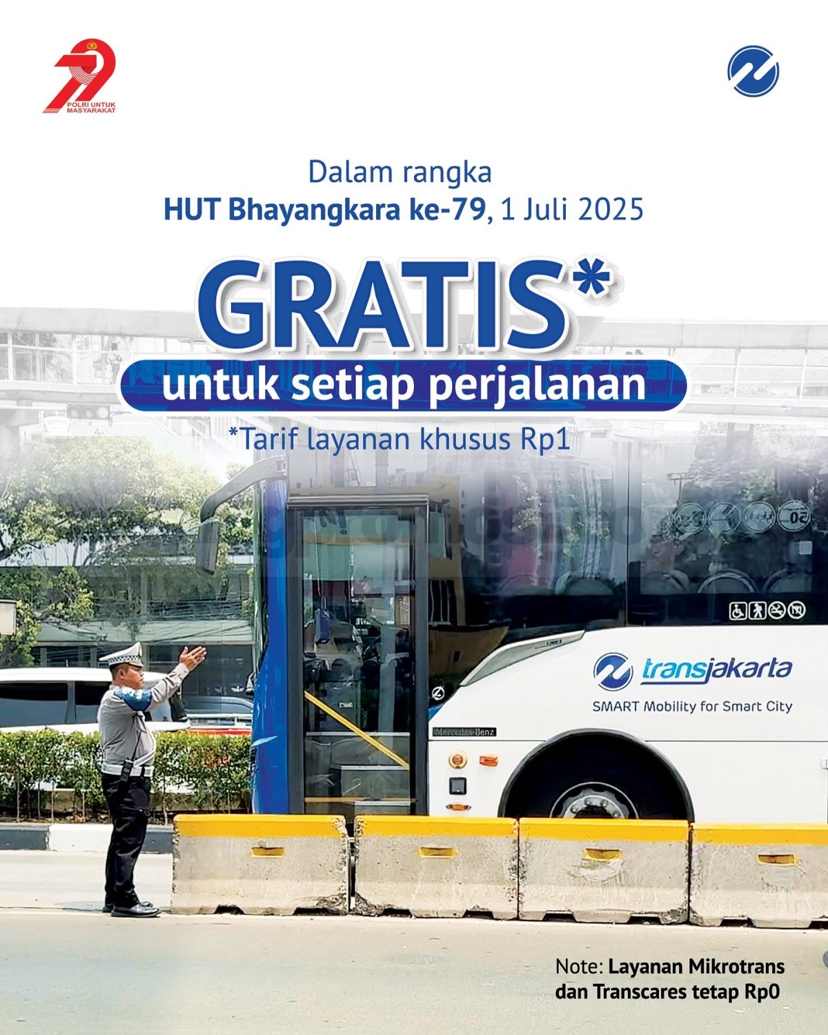 Promo ini berlaku untuk semua rute dan bisa kamu nikmati berkali-kali sepanjang hari. Cocok banget buat rayain Hari Bhayangkara sambil jelajahi kota dengan transportasi publik yang aman, nyaman, dan hemat.