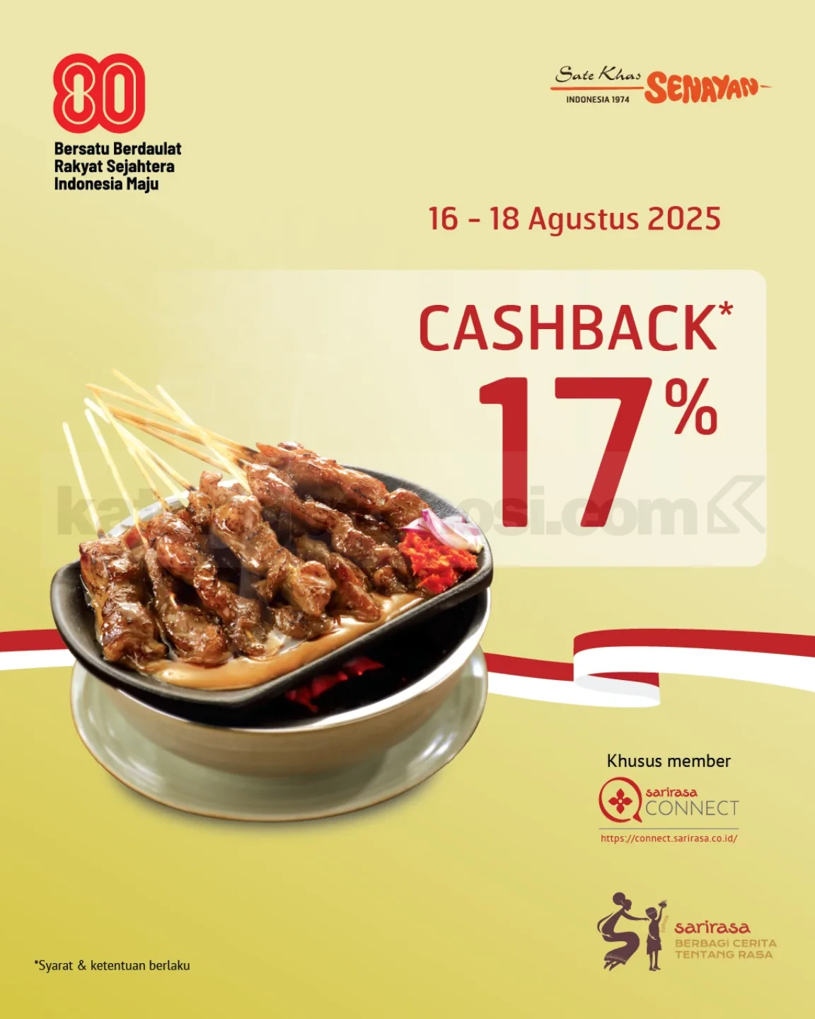 Promo HUT RI ke 80 SATE KHAS SENAYAN Cashback 17% Khusus Untuk Member*, khusus untuk member Sarirasa Connect yang aktif. tanggal 16โ18 Agustus 2025.