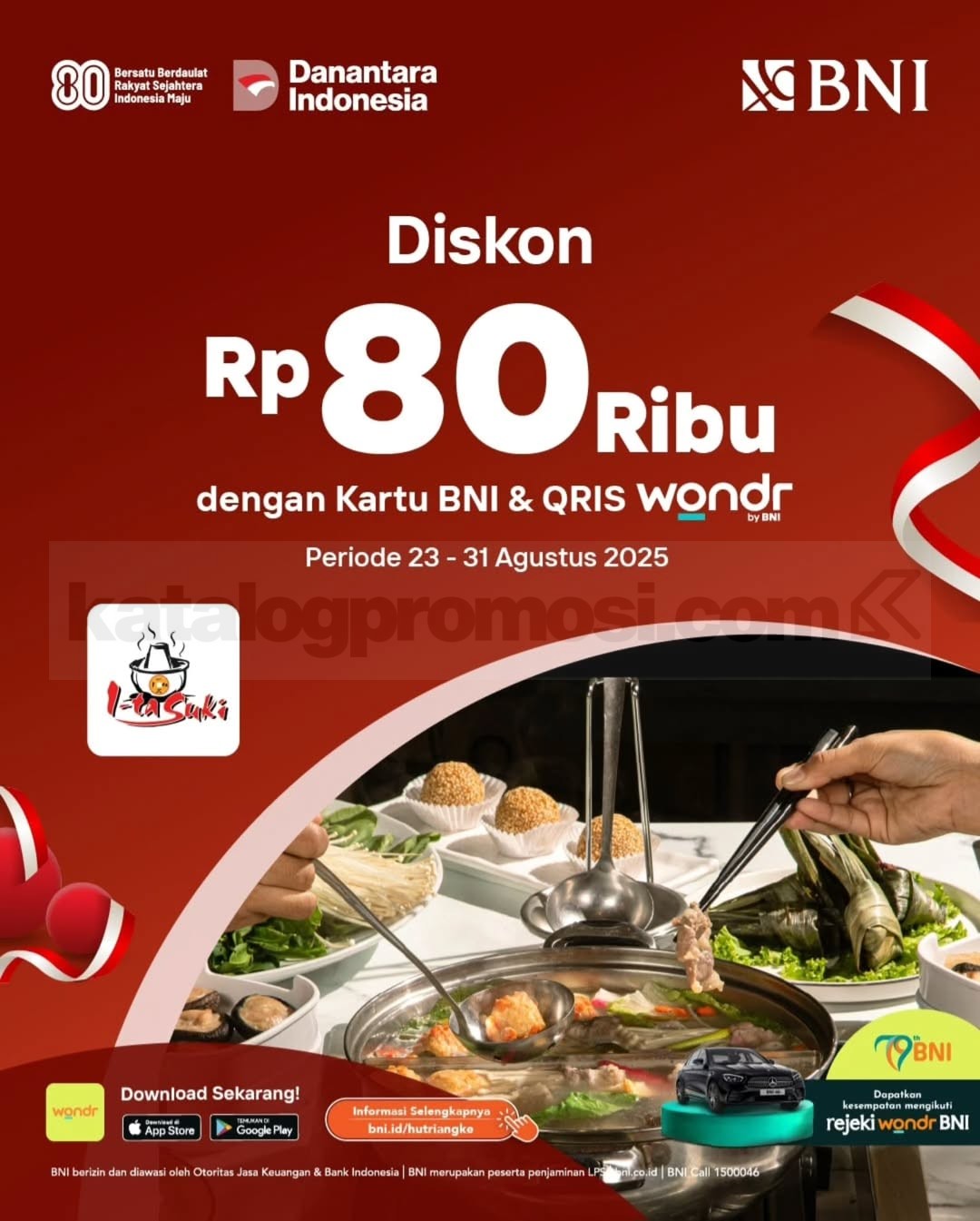 Promo I-tasuki Spesial BNI Diskon 80rb berlaku 23โ31 Agustus 2025! Dapatkan potongan harga spesial pakai Kartu BNI & QRIS wondr by BNI.