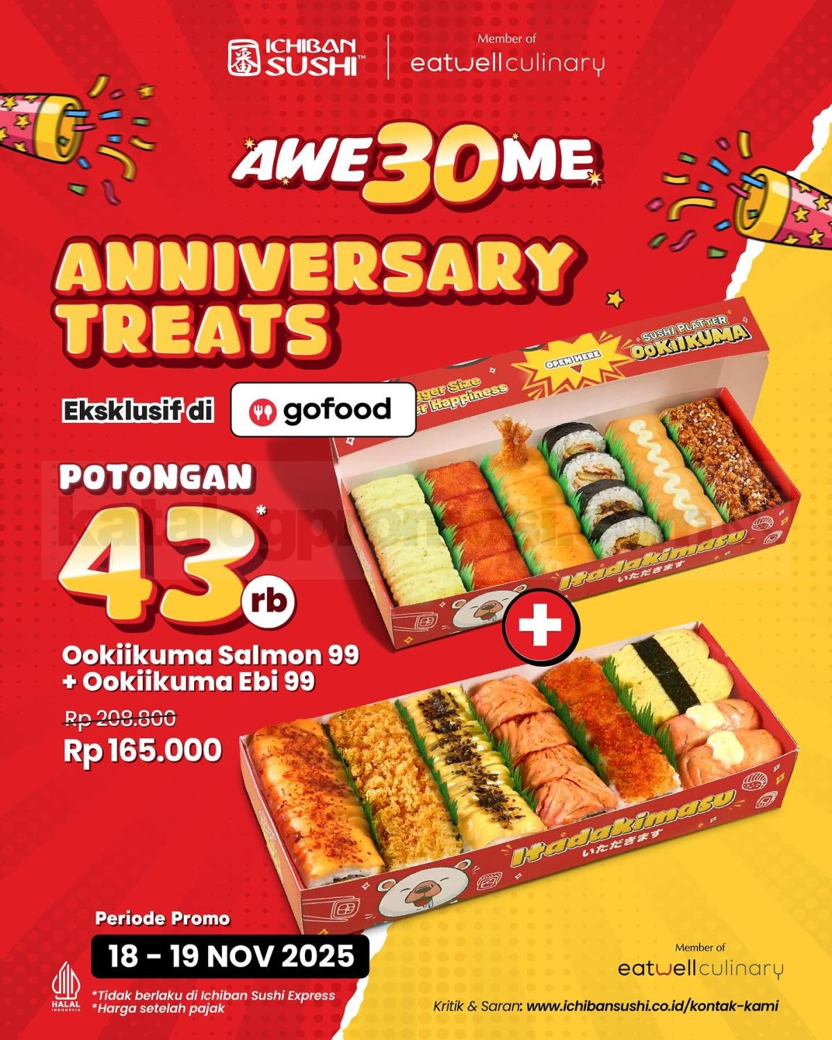 Promo Ichiban Sushi Anniversary Treats Bundling Ookiikuma Rp.43.000 dengan potongan spesial via GoFood, berlaku 18 November 2025 – 19 November 2025, di lokasi tertentu.