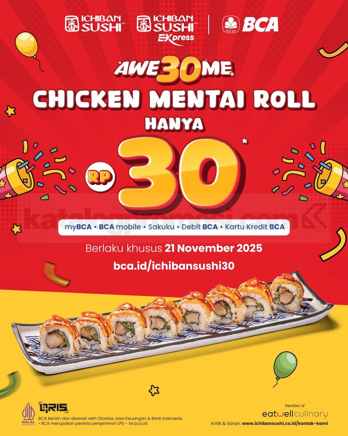 Promo Ichiban Sushi BCA AWE30ME Chicken Mentai Roll Rp30 berlaku 21 November 2025 dengan pembayaran myBCA, BCA Mobile, Sakuku, Debit BCA, atau Kartu Kredit BCA.