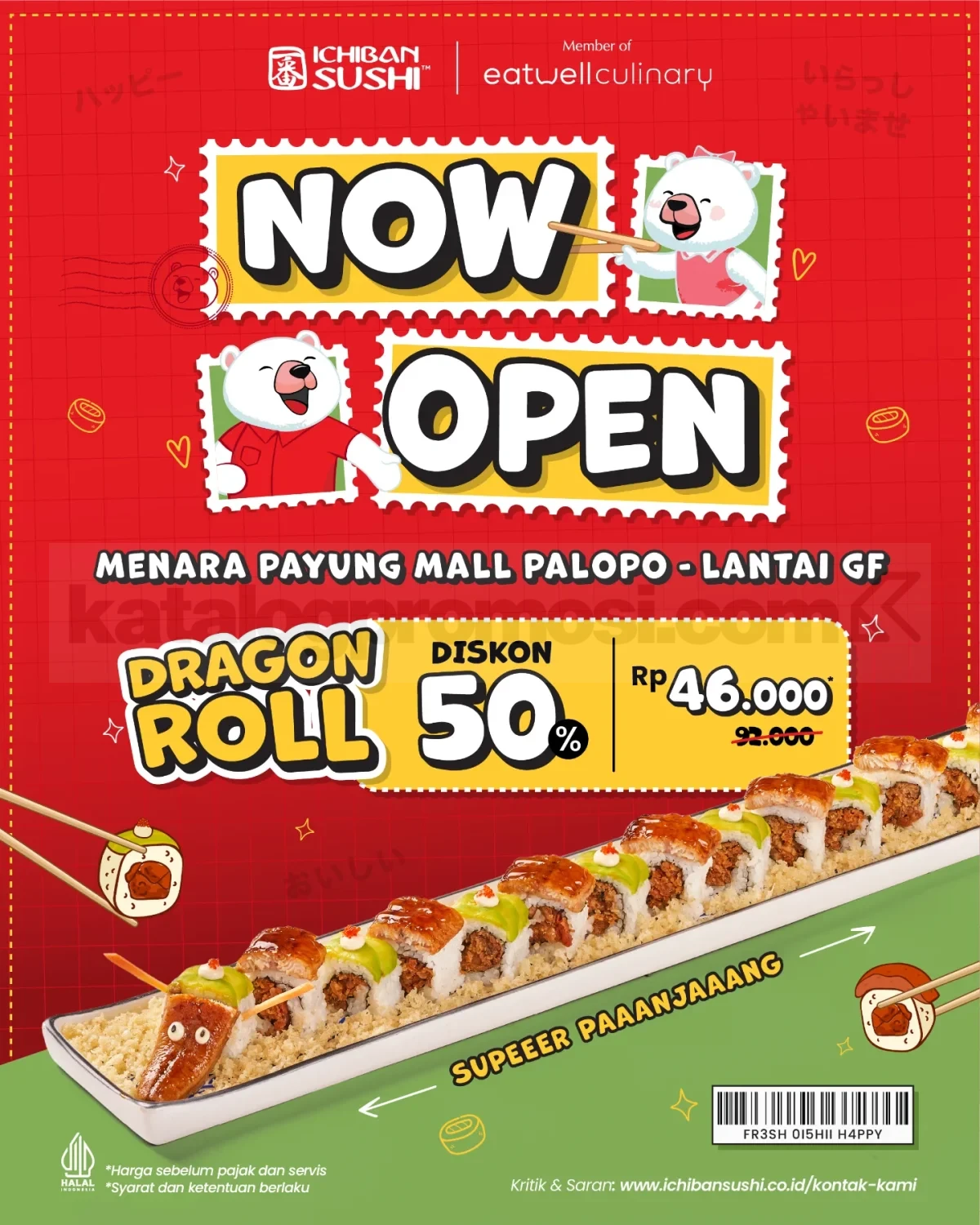 Promo Ichiban Sushi Opening Polopo Dragon Roll Diskon 50% untuk menu Dragon Roll super panjang dine in berlaku selama periode promo pembukaan di Menara Payung Mall Palopo.