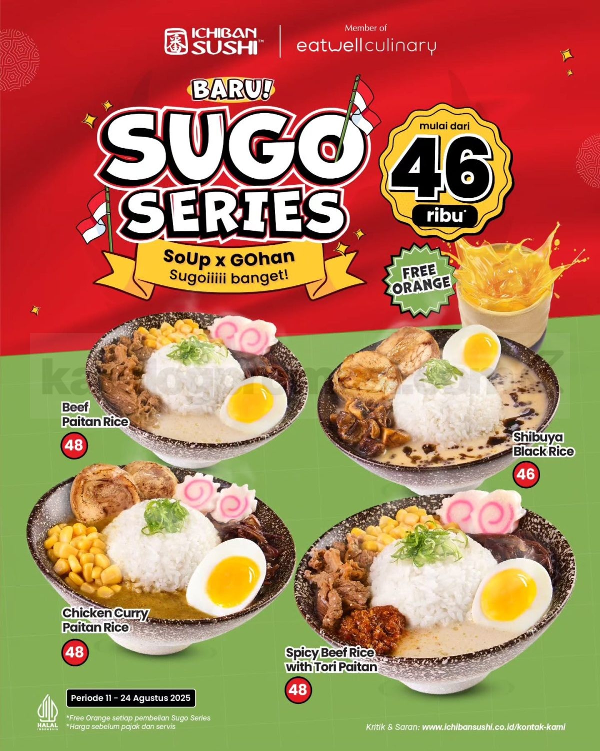 Promo Ichiban Sushi Sugo Series mulai Rp46.000 dengan 4 pilihan menu baru lengkap free orange segar, berlaku 11–24 Agustus 2025