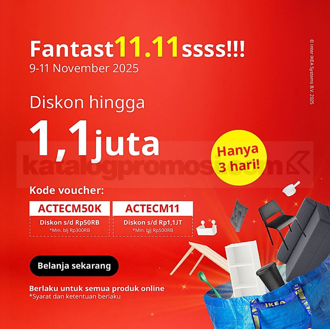 Promo IKEA 11.11 Fantast11.11sss diskon hingga Rp. 1.100.000 berlaku 9–11 November 2025 di website dan aplikasi IKEA Indonesia untuk semua produk online.