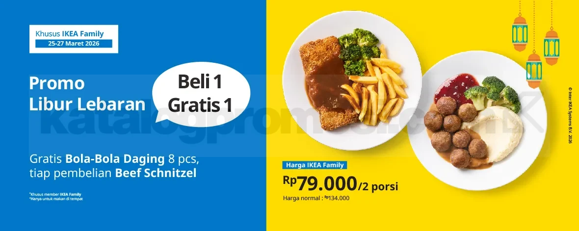 Totalnya jadi 2 porsi di harga Rp. 79.000, sementara harga normalnya Rp. 134.000. Promo IKEA Libur Lebaran Beli 1 Gratis 1 ini berlangsung dari 25 β 27 Maret 2026.