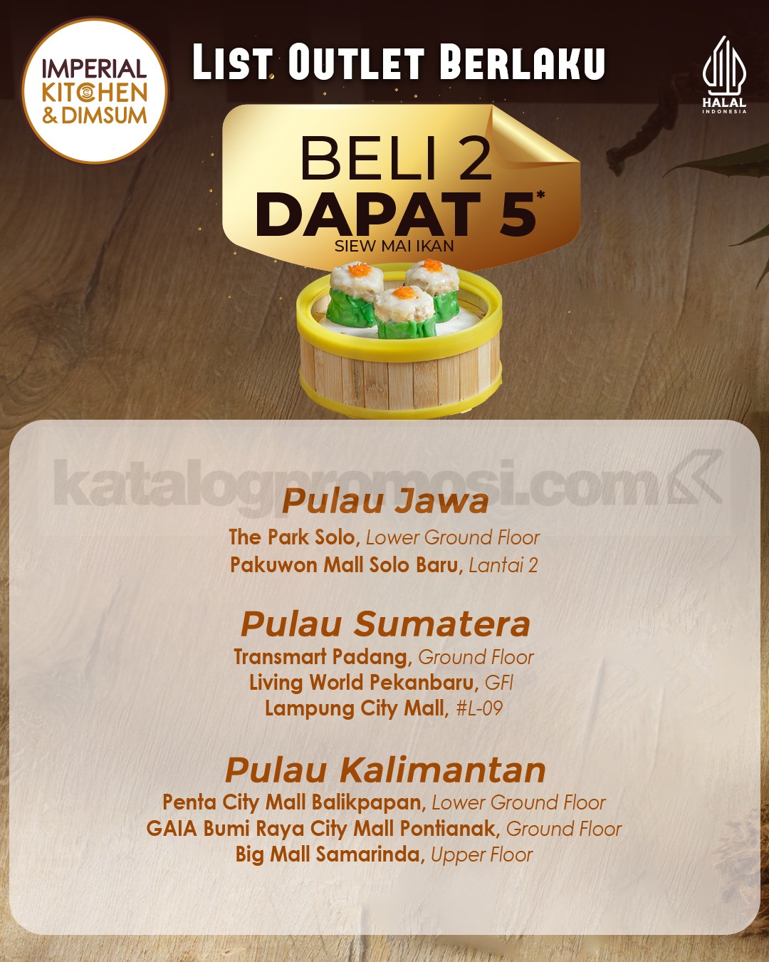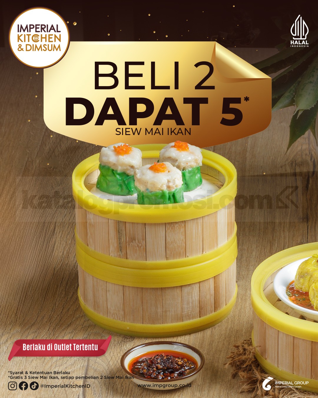 Promo Imperial Kitchen & Dimsum Gratis 3 Siew Mai Ikan setiap pembelian 2 Siew Mai Ikan, berlaku hanya di outlet tertentu.