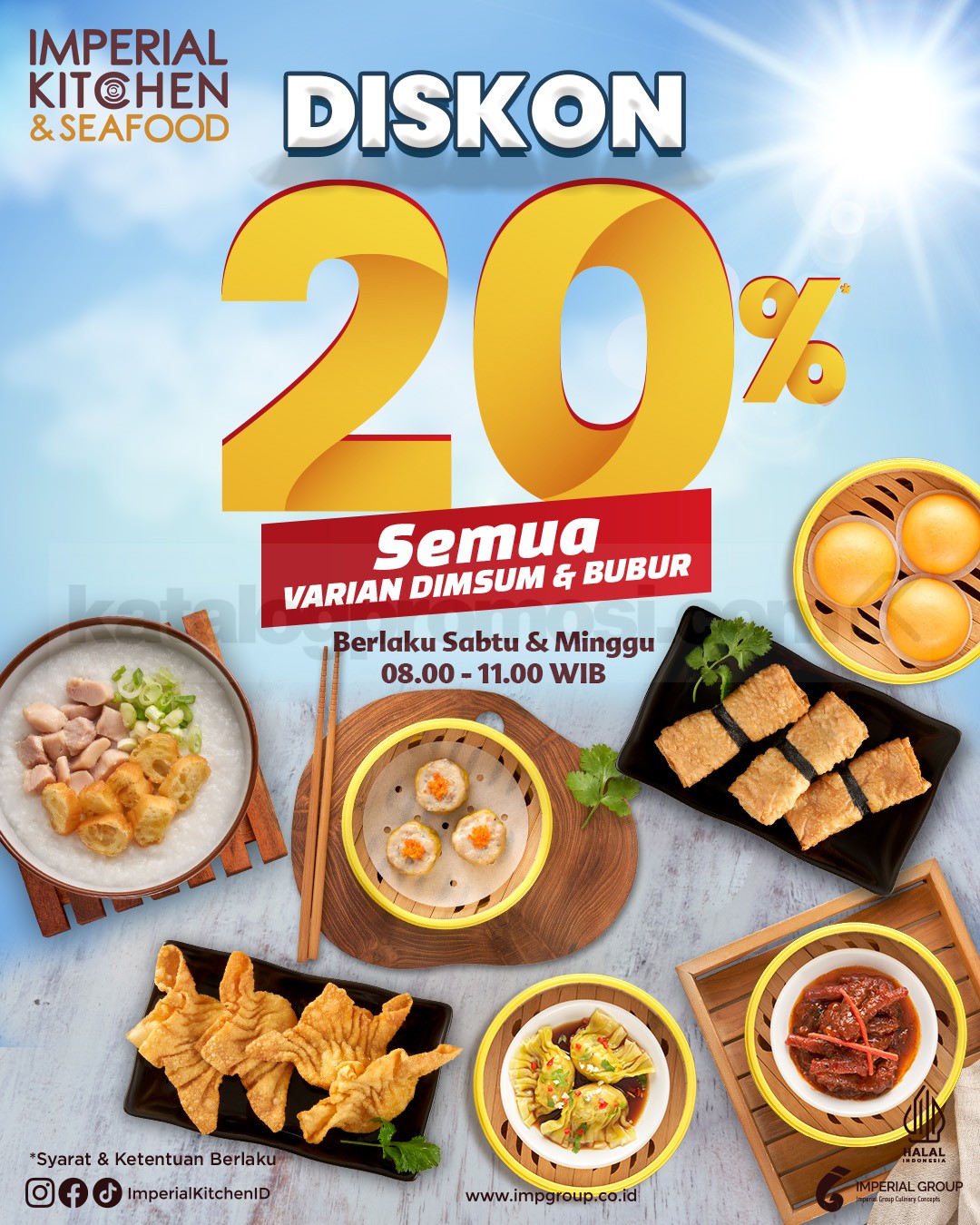 Promo Imperial Kitchen Diskon 20% Semua Dimsum & Bubur nikmati dine-in setiap Sabtu – Minggu pukul 08.00–11.00 berlaku di seluruh outlet.