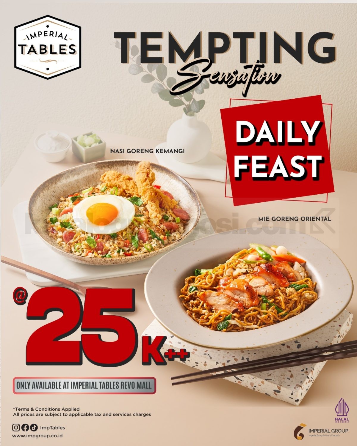 Promo Imperial Tables Tempting Sensation Rp. 25.000 untuk menu Nasi Goreng Kemangi atau Mie Goreng Oriental, berlaku hingga 15 Desember 2025 di Imperial Tables Revo Mall Bekasi.