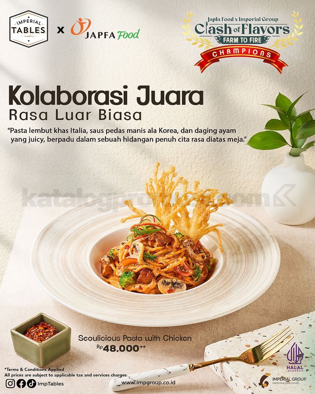 Promo IMPERIAL TABLES x JAPFA FOOD new menu Seoulicious Pasta with Chicken Rp. 48 ribu berlaku hingga 14 Januari 2026 di seluruh outlet Imperial Tables Indonesia.