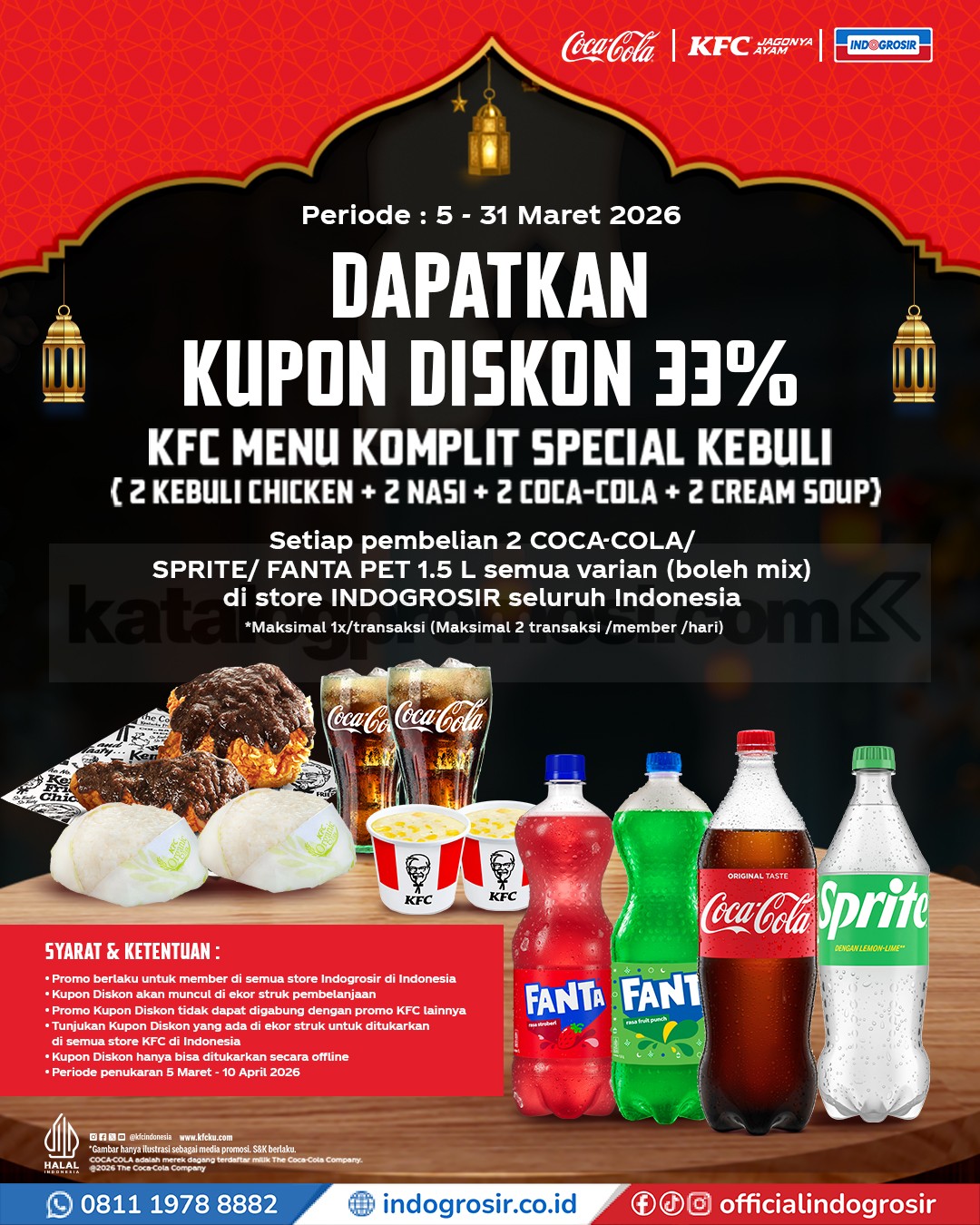 Promo Indogrosir Kupon Diskon 33% KFC Menu Kebuli periode 5 – 31 Maret 2026 untuk pembelian Coca-Cola, Sprite, atau Fanta PET 1.5L di store Indogrosir seluruh Indonesia.