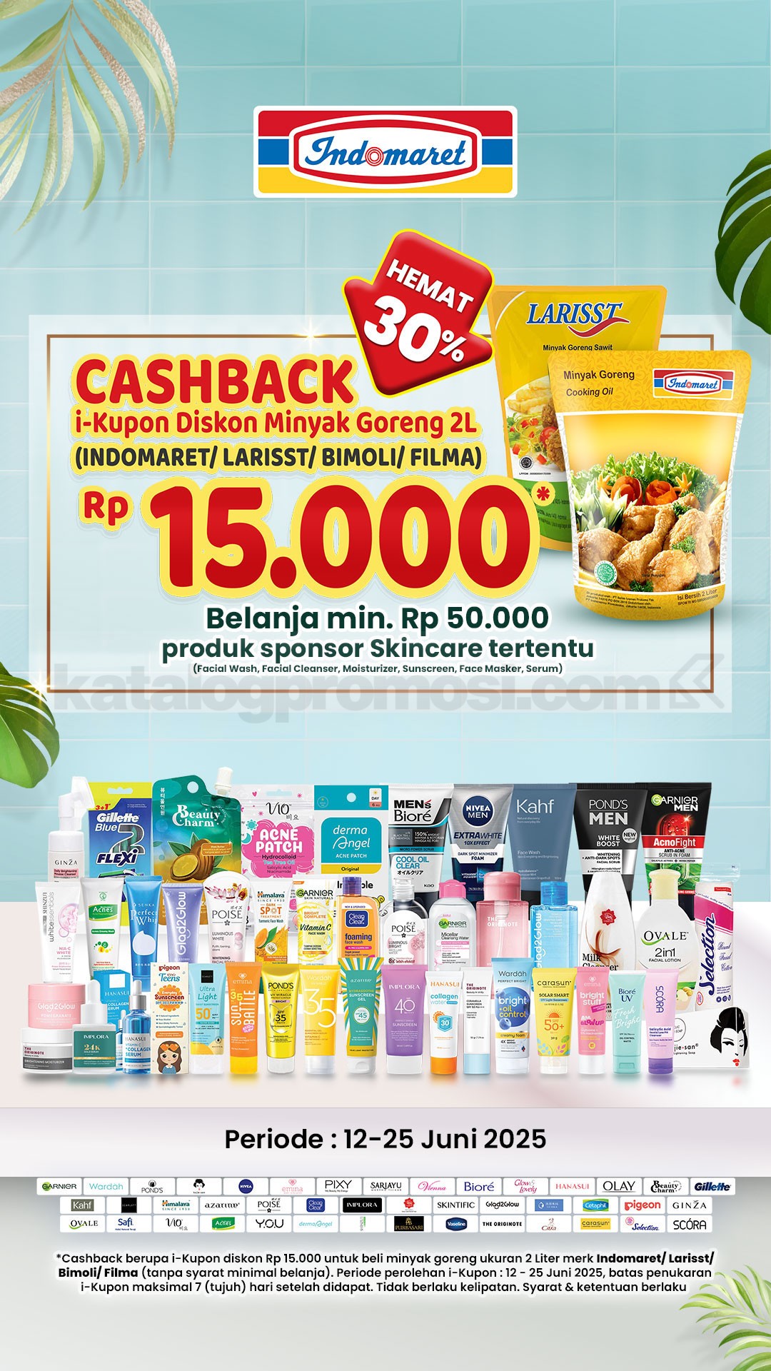 Promo Indomaret Cashback i-Kupon Diskon Minyak Goreng 2L cuma belanja skincare Rp50.000! Berlaku 12β25 Juni 2025. Ayo serbu sebelum kehabisan!