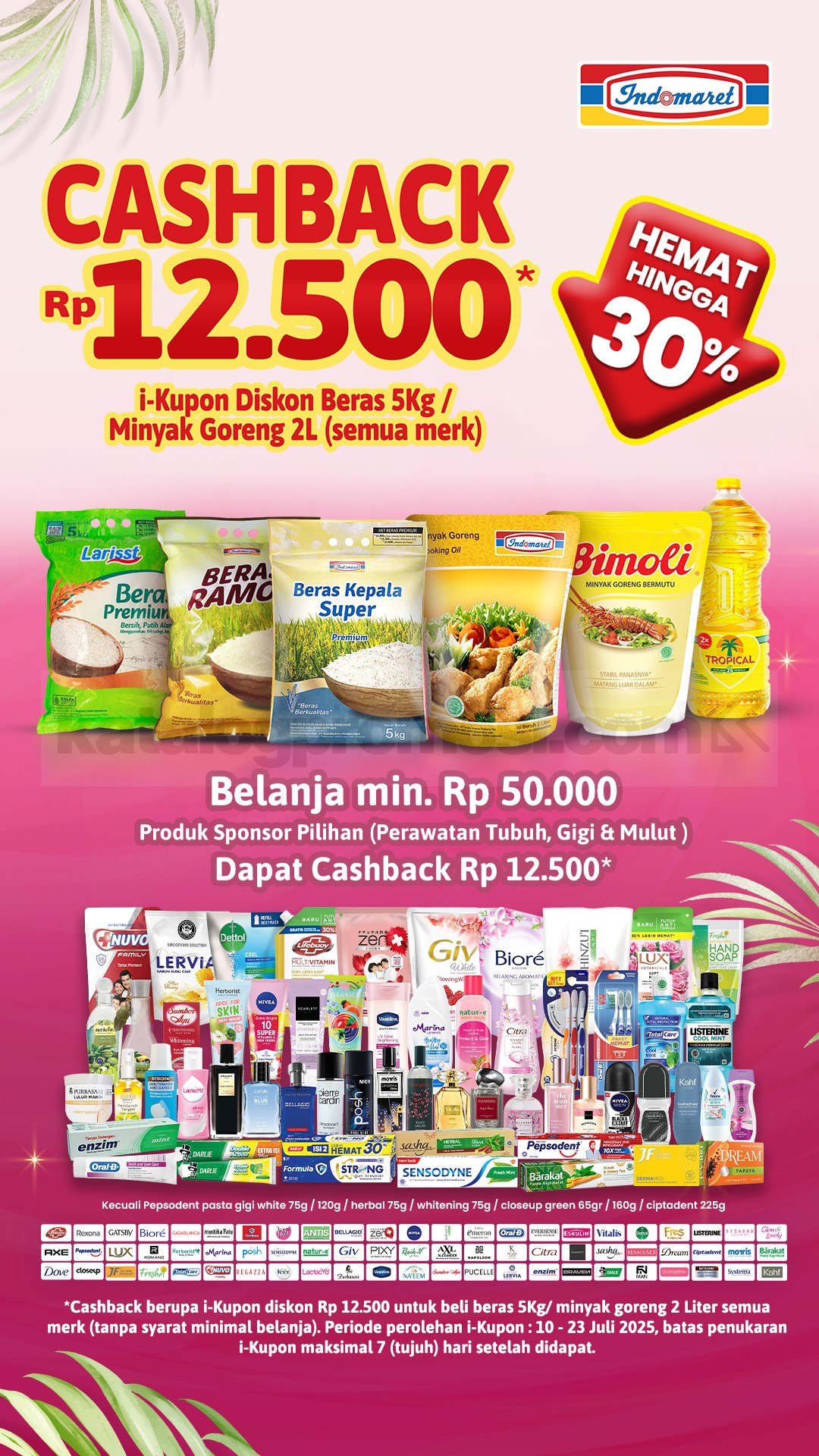 Promo Indomaret cashback i-Kupon Rp12.500 berlaku 10–23 Juli 2025! Belanja Rp50.000 produk sponsor dapat diskon beras 5kg atau minyak goreng 2L tanpa minimum pembelanjaan.