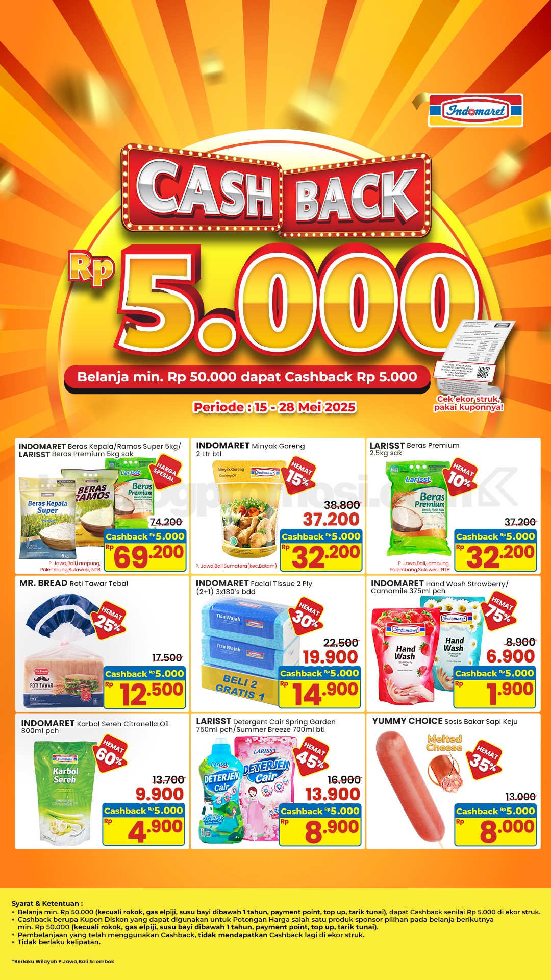 Belanja di Indomaret Belanja minimal Rp. 50.000 (tidak termasuk rokok, susu bayi di bawah 1 tahun, pulsa, dll) untuk mendapatkan cashback Rp. 5.000