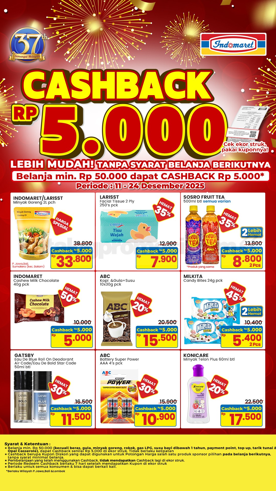 Promo IndomaretCashback Rp. 5.000 – Belanja minimal Rp 50.000 dapat kupon potongan produk sponsor, berlaku 11-24 Desember 2025