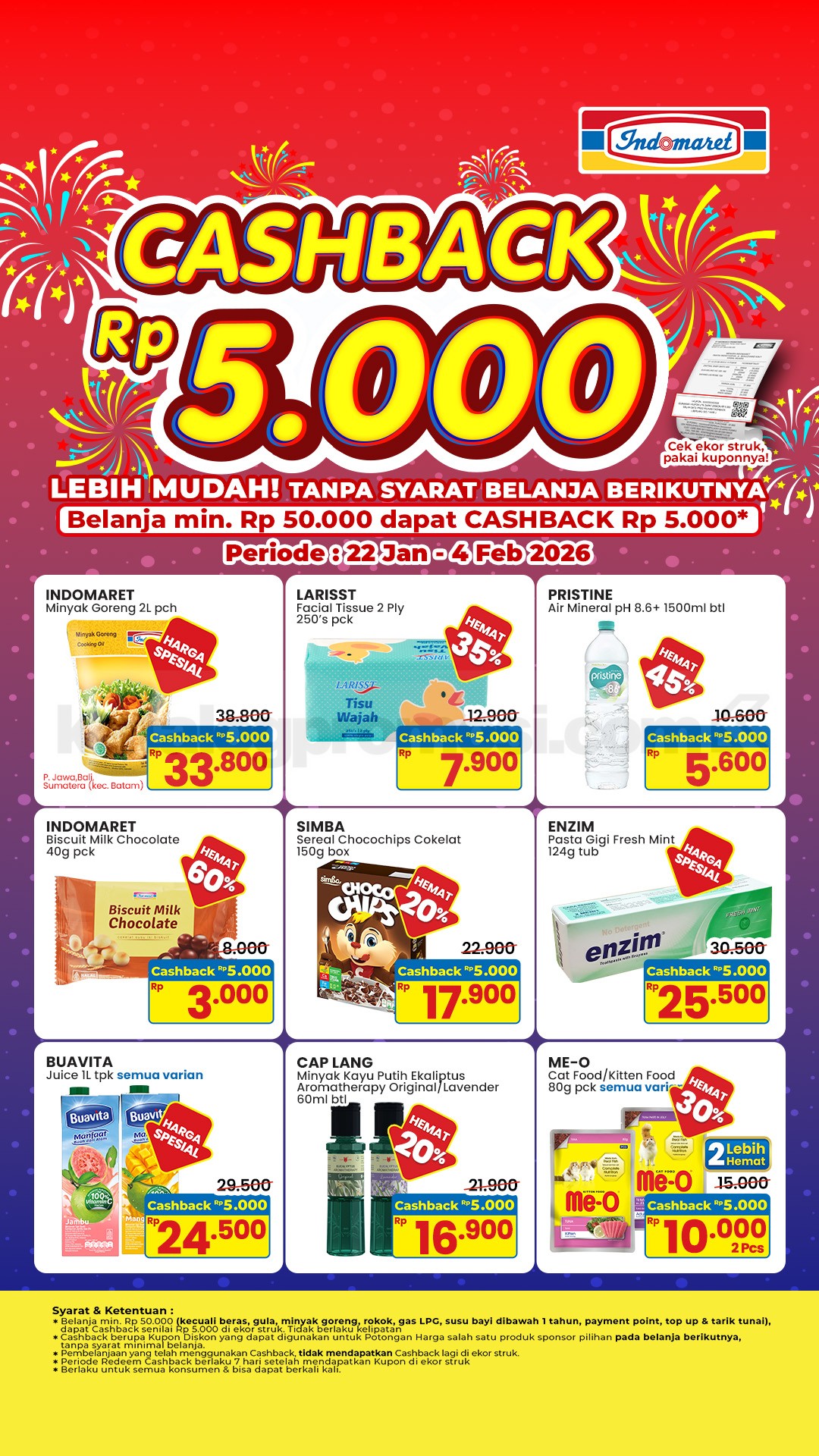 Promo IndomaretCashback Rp. 5.000 – Belanja minimal Rp 50.000 dapat kupon potongan produk sponsor, berlaku 22 Januari – 05 Februari 2026