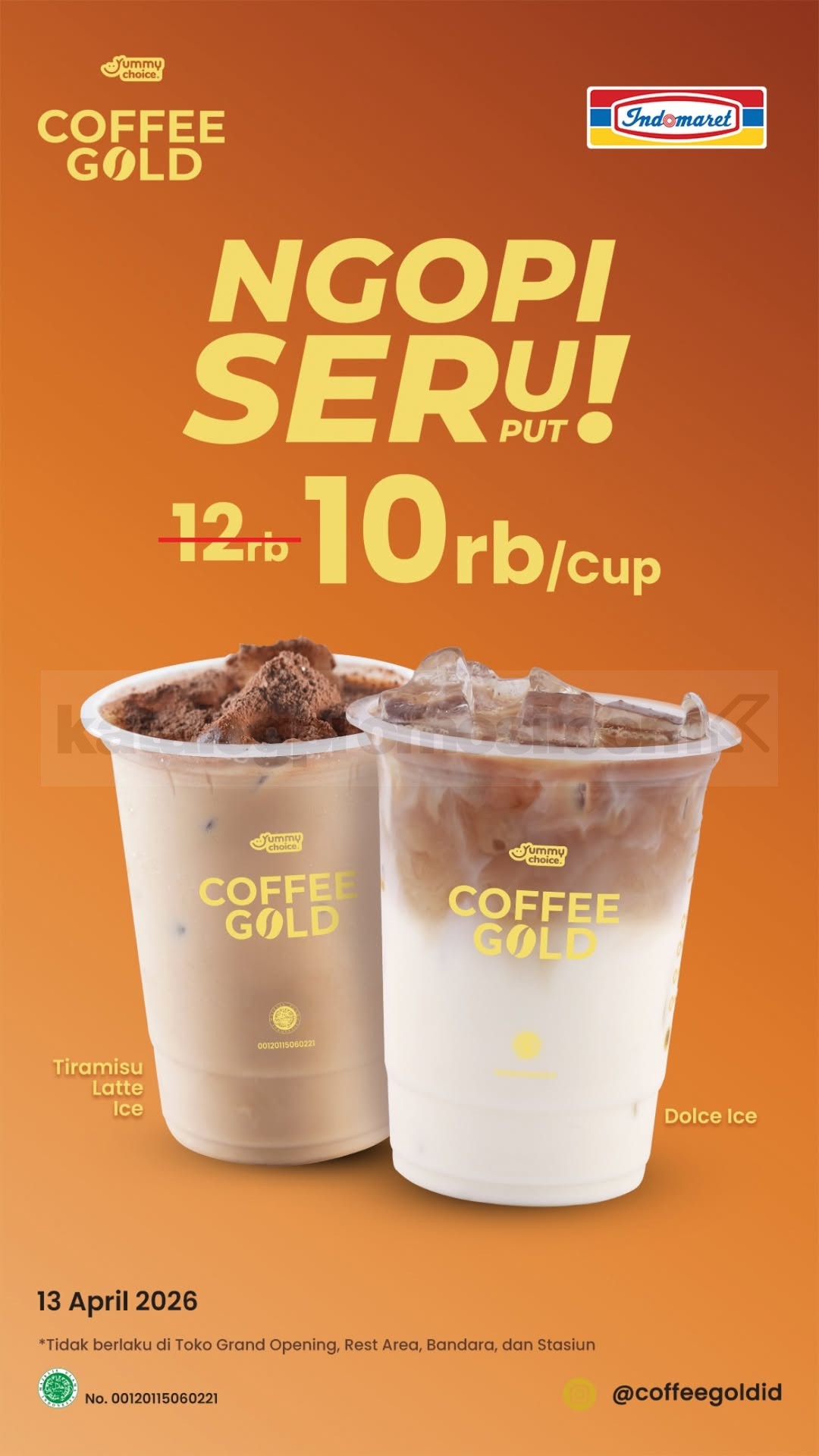 Promo Indomaret Coffee Gold Ngopi Seruput Rp. 10.000 pilihan Dolce Ice dan Tiramisu Latte Ice berlaku mulai tanggal 13 April 2026 di outlet tertentu
