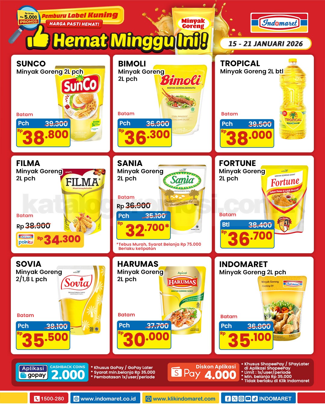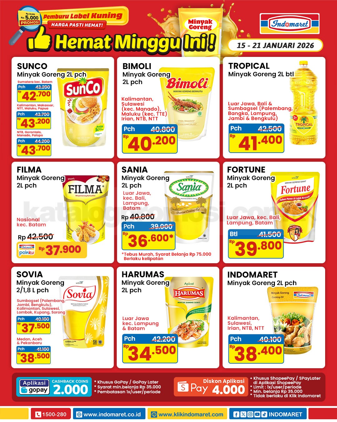Saatnya belanja minyak goreng dengan harga lebih hemat di Indomaret! Promo Minyak Murah Indomaret berlaku nasional dan bisa kamu nikmati selama periode 15-21 Januari 2026. Jangan lupa, ada berbagai metode pembayaran spesial yang bisa bikin belanja kamu makin murah, seperti pakai Kartu Debit BRI Mastercard, aplikasi GoPay, atau Kredivo.