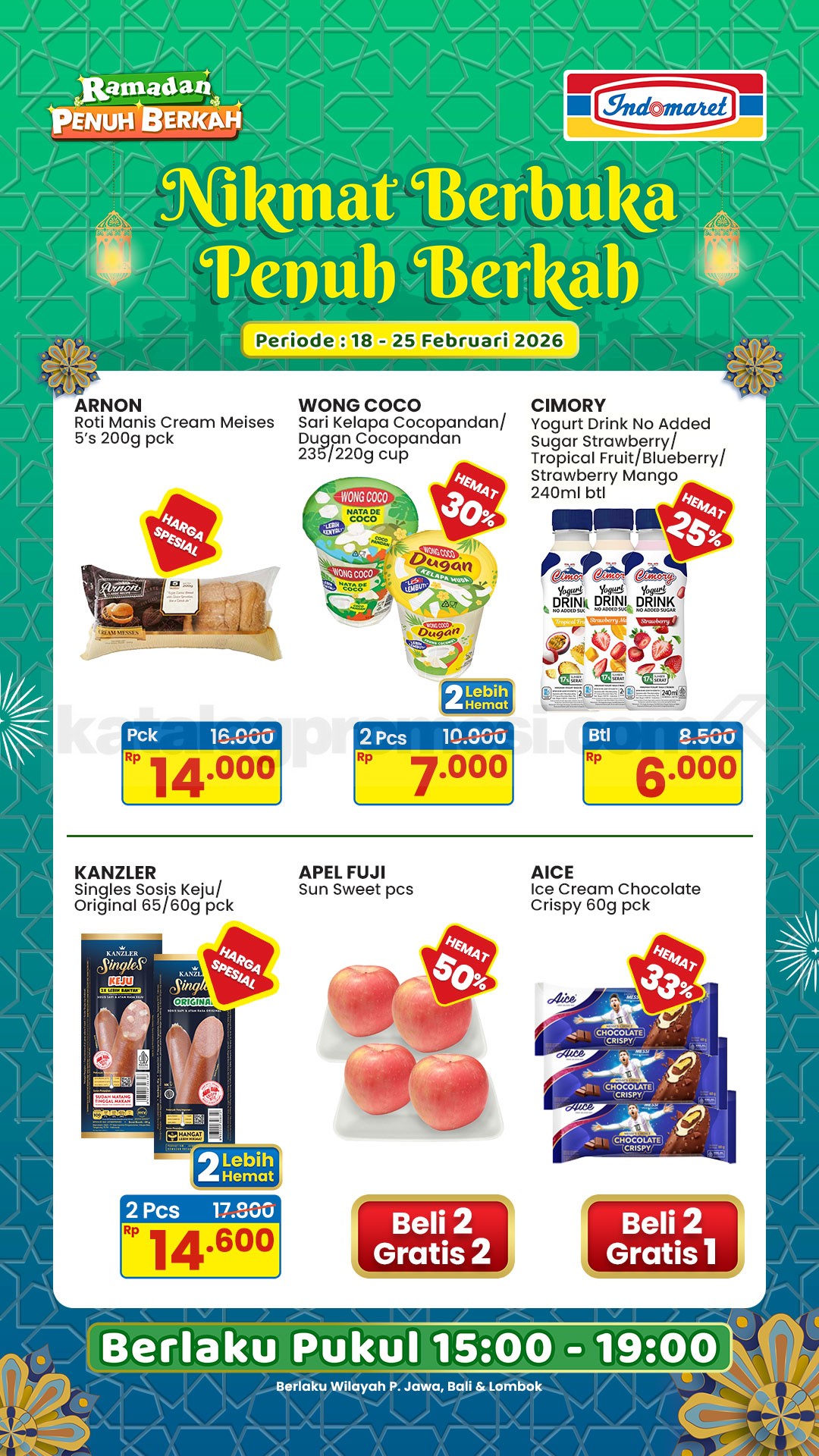 Promo Indomaret Ramadan Nikmat Berbuka periode 18 – 25 Februari 2026 berlaku pukul 15.00 – 19.00 wilayah Jawa, Bali, dan Lombok.