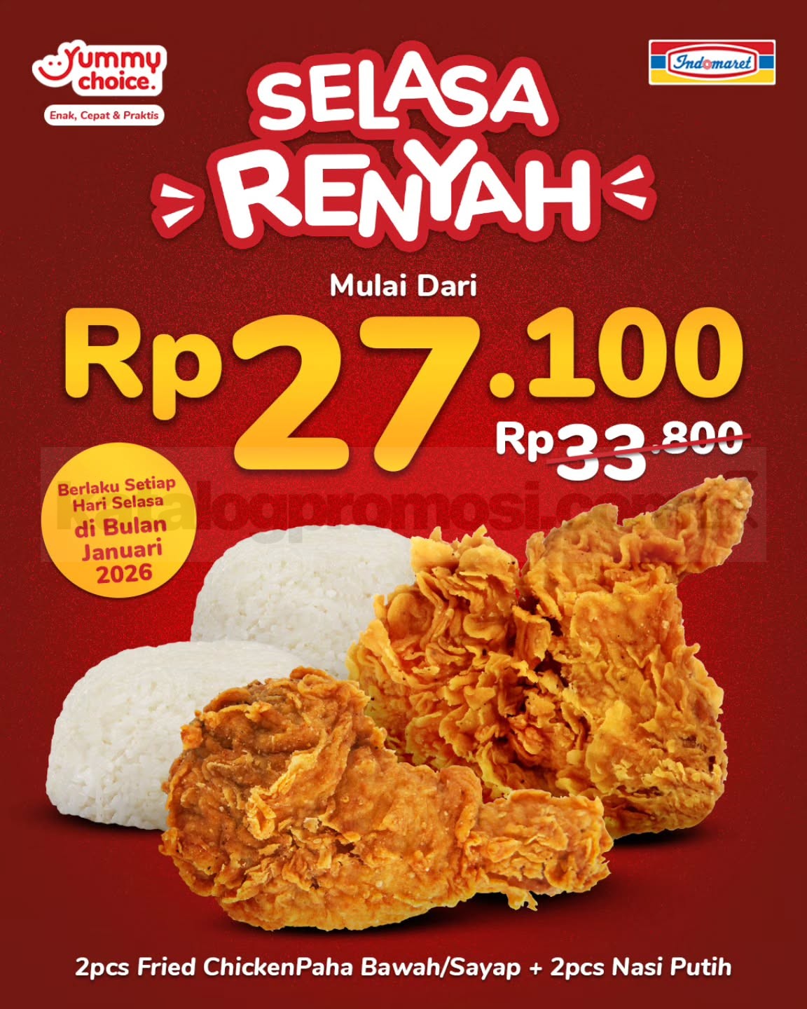 Promo Indomaret Selasa Renyah 2 Ayam 2 Nasi Rp. 27.100 paket fried chicken crispy dengan nasi putih, berlaku mulai 6 Januari 2026 – 27 Januari 2026 di Indomaret.