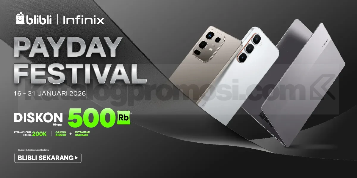 Promo Infinix Payday Festival diskon hingga Rp. 500.000, voucher ekstra dan cashback bank via Blibli, berlaku mulai tanggal 16 Januari 2026 – 31 Januari 2026.