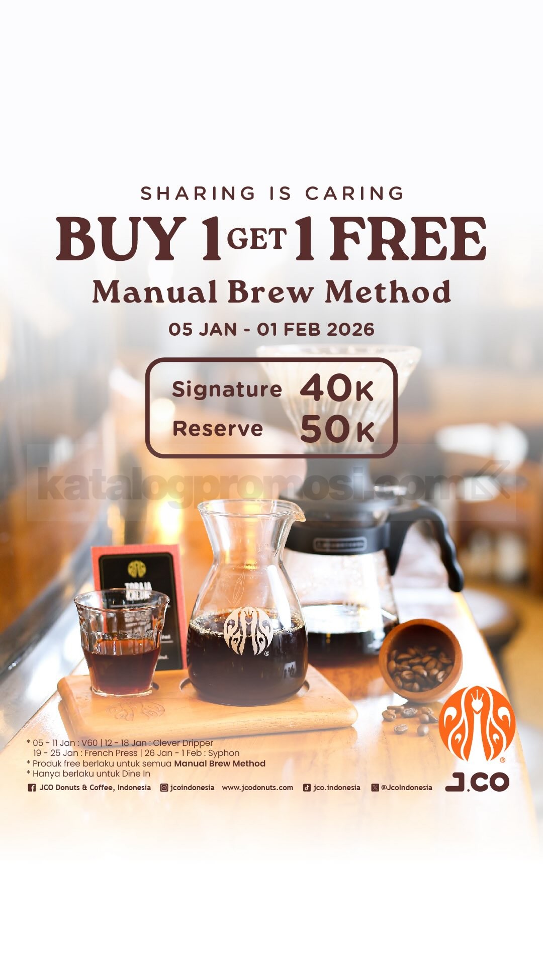 Promo J.CO Buy 1 Get 1 Coffee Manual Brew beli satu coffee manual brew dan dapatkan satu cup tambahan tanpa biaya. Berlaku dine in di outlet J.CO selama periode Januari hingga awal Februari 2026.