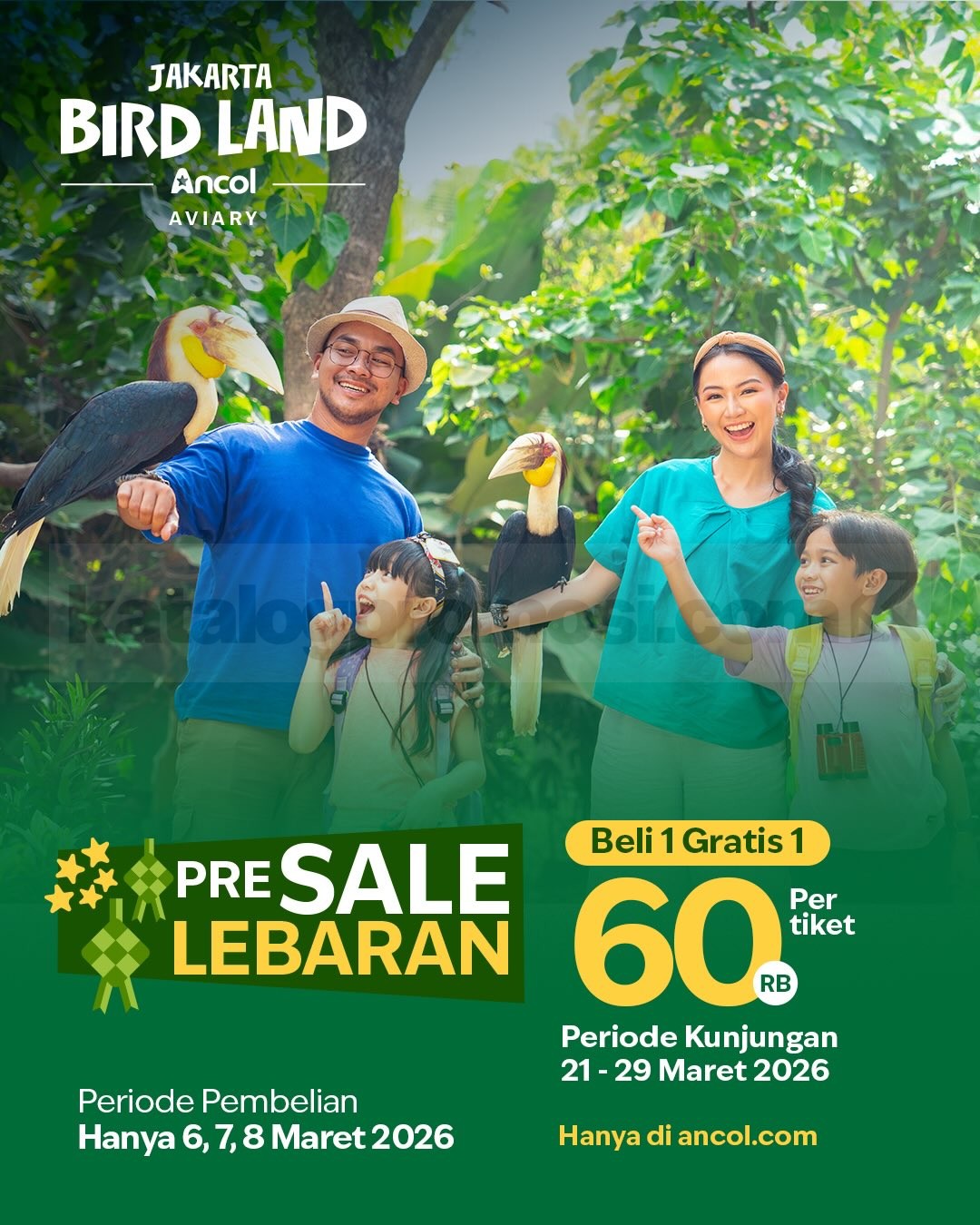 Promo Jakarta Bird Land Ancol Presale Lebaran Beli 1 GRATIS 1 periode pembelian 6 – 8 Maret 2026 untuk kunjungan 21 – 29 Maret 2026 melalui ancol.com.