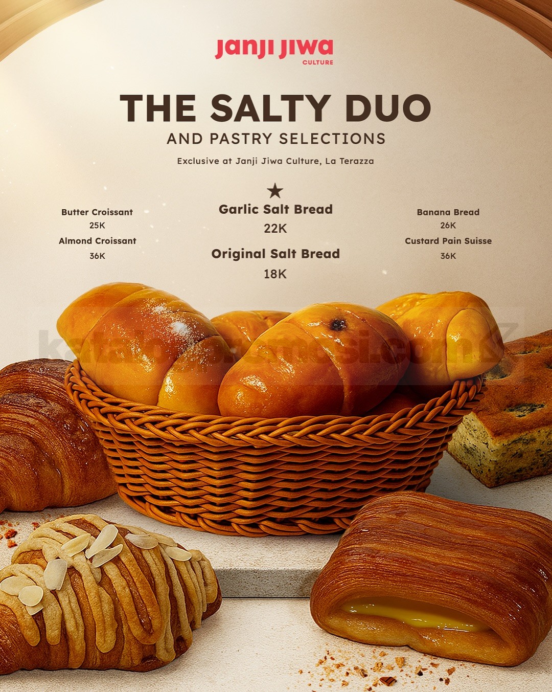 Your coffee’s favorite plus one has arrived! Saatnya kenalan dengan The Salty Duo: Garlic Salt Bread dan Original Salt Bread, yang hadir bersama pilihan pastry kurasi Janji Jiwa Culture. Dipanggang sempurna, berpadu manis dengan kopi atau cokelat favoritmu, dan siap kamu nikmati di La Terazza.
