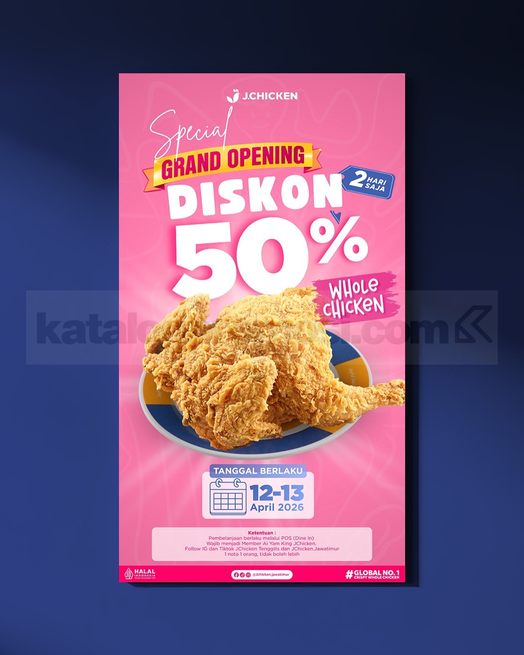 - Diskon 50% whole chicken hanya berlaku pada 12–13 April 2026 untuk dine in melalui POS.