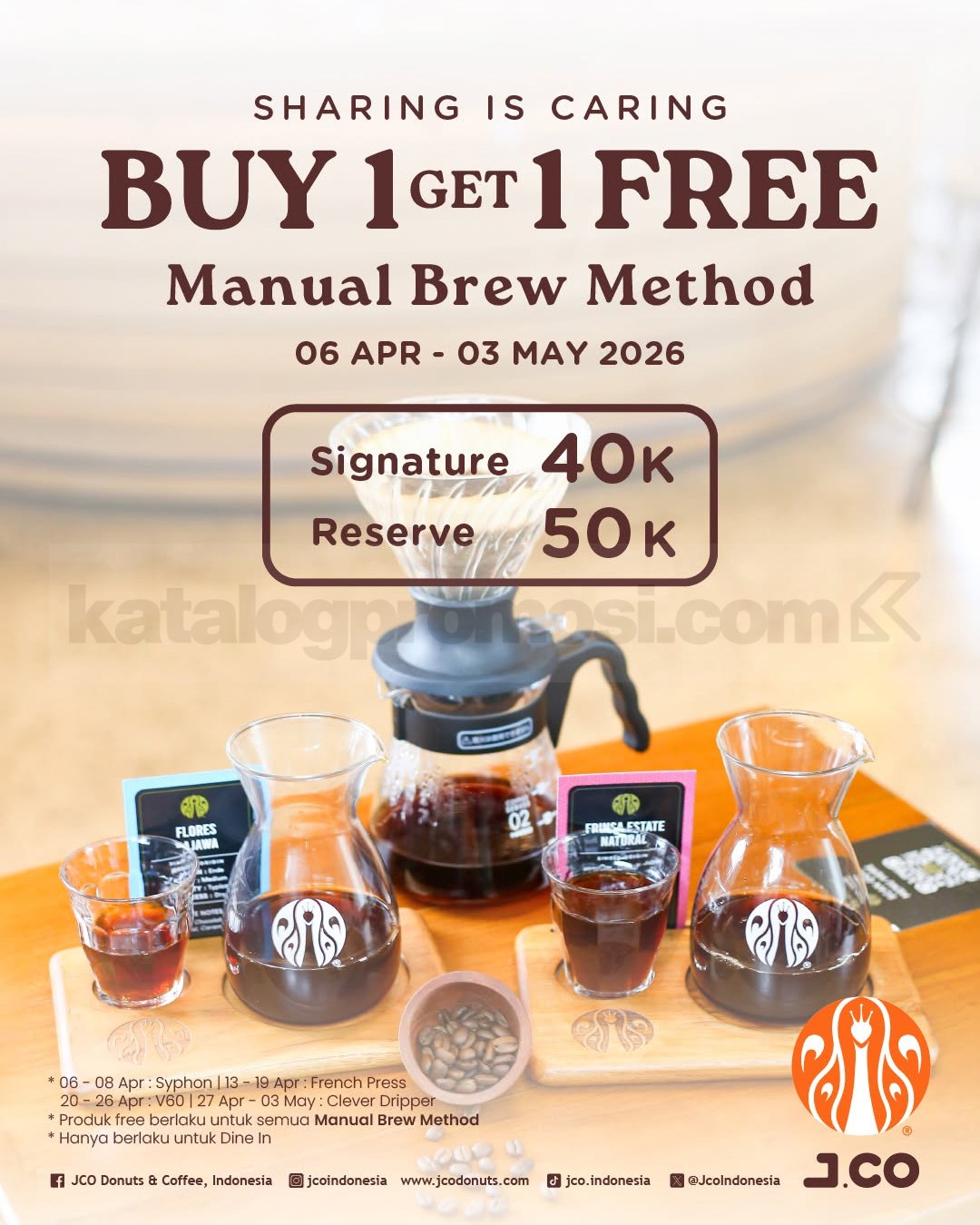 Promo JCO Buy 1 Get 1 Manual Brew Coffee periode 6 April – 3 Mei 2026 untuk dine in di seluruh outlet JCO Indonesia dengan pilihan metode manual brew tertentu