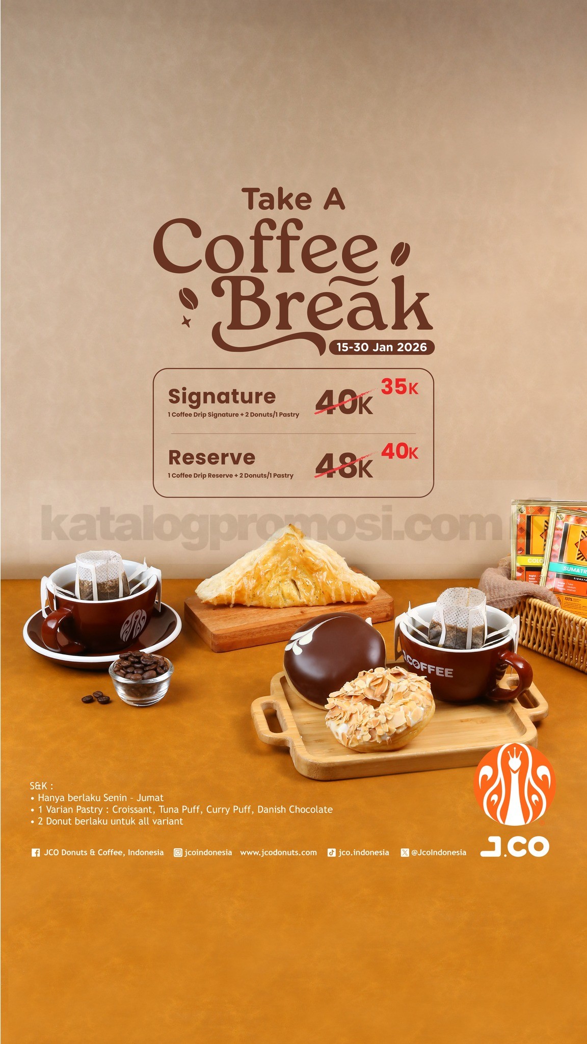Promo JCO Coffee Break Signature & Reserve mulai Rp. 35.000 paket kopi drip dengan donut atau pastry, cocok untuk rehat kerja, berlaku mulai 15 Januari 2026 – 30 Januari 2026 di seluruh outlet.