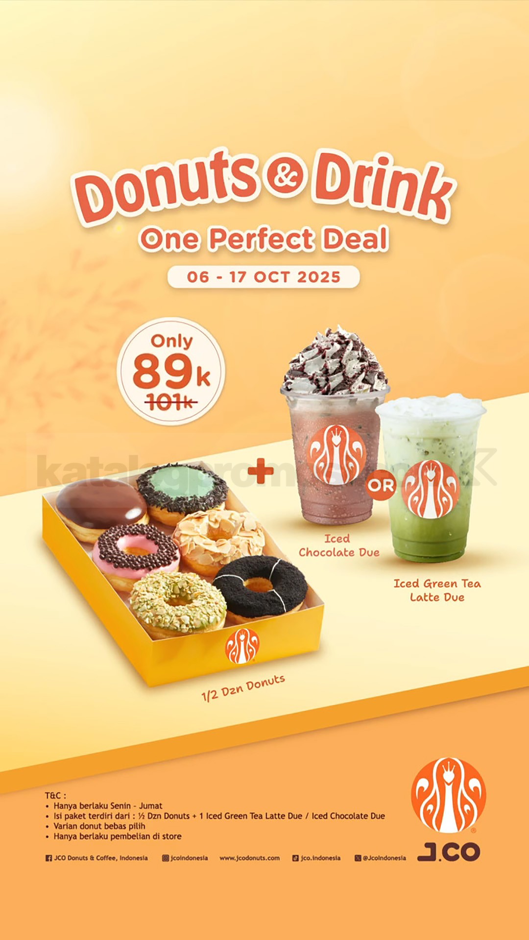 Promo JCO Donuts & Drink One Perfect Deal mulai Rp. 89.000 berisi ½ lusin donuts dan 1 Iced Green Tea Latte atau Iced Chocolate, berlaku 6–17 Oktober 2025.