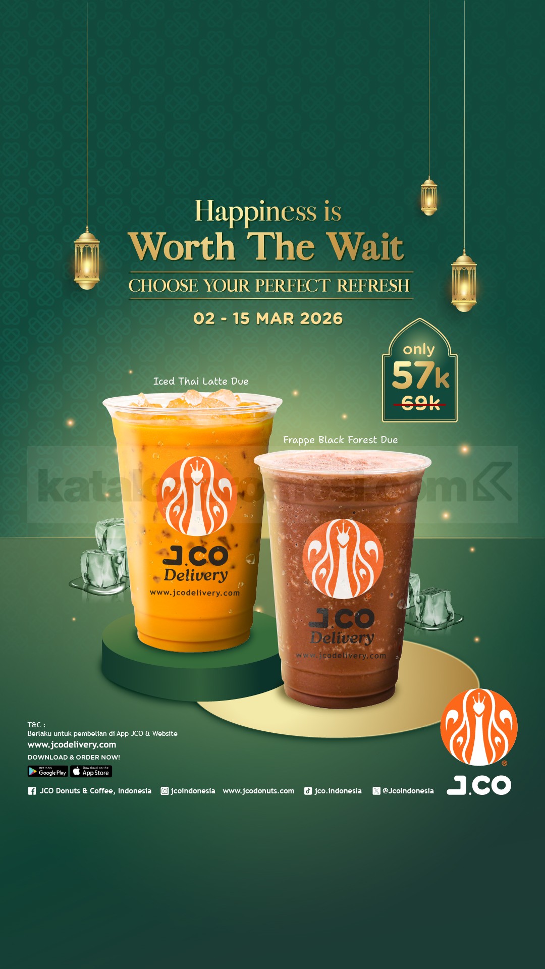 Promo JCO Double Delight Minuman Due Rp. 57.000 paket dua minuman delivery melalui aplikasi dan website berlaku mulai tanggal 2 Maret 2026 – 15 Maret 2026.