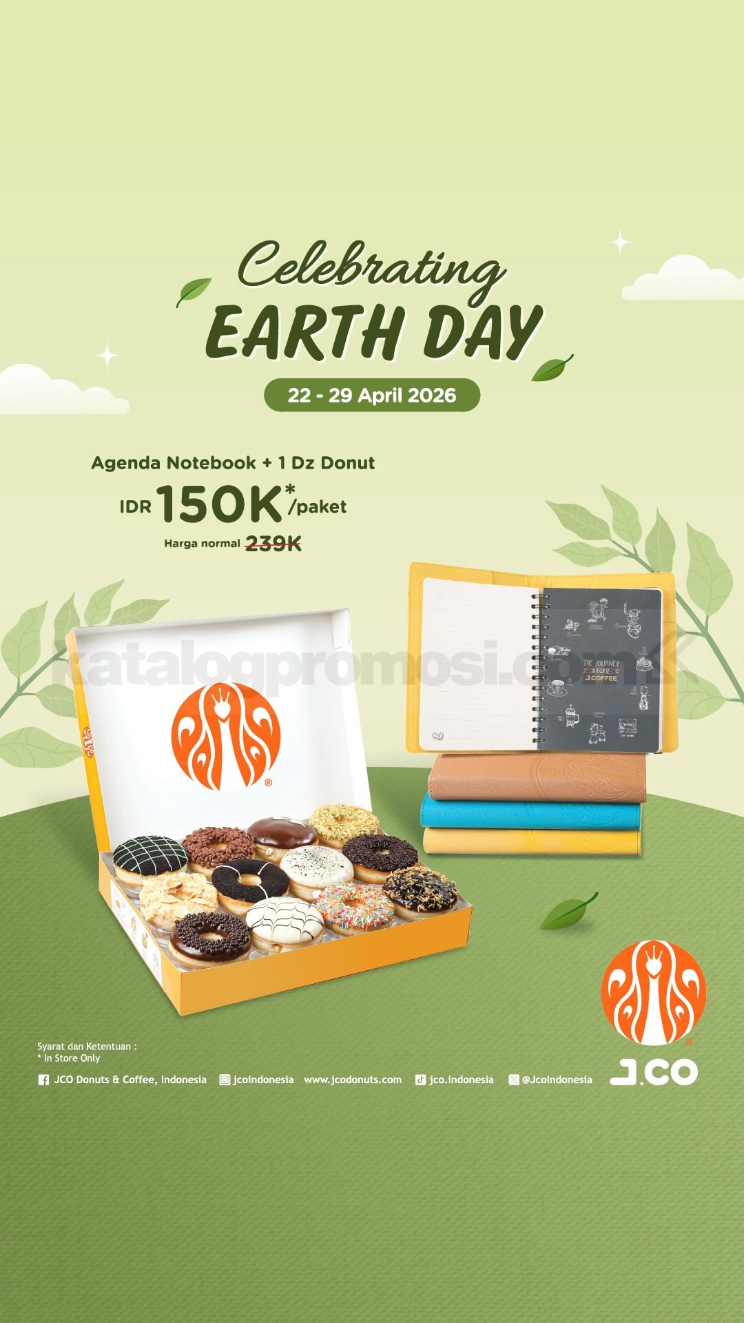 Promo JCO Earth Day Donat + Notebook Rp. 150.000 dapatkan 1 lusin donat dan notebook berlaku 22 April 2026 – 29 April 2026 di seluruh outlet