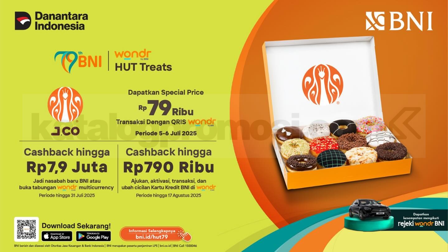 Promo JCO HUT BNI 79 1 lusin donut cuma Rp79.000 pakai QRIS wondr by BNI berlaku 5–6 Juli 2025 jam 19.00–21.00 di seluruh outlet JCO