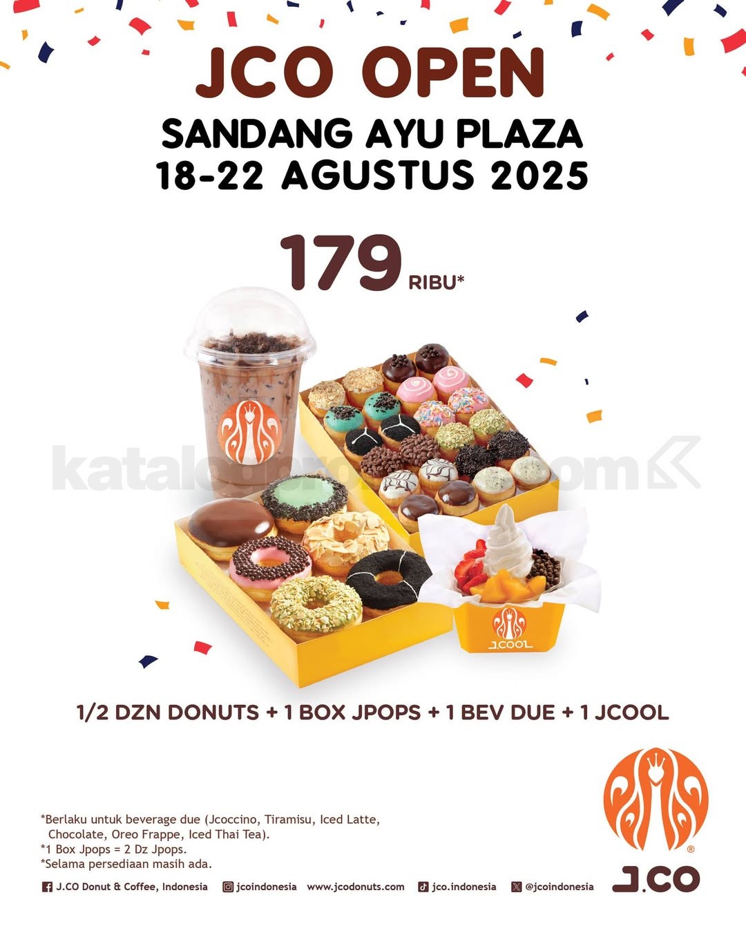 Promo JCO Opening Sandang Ayu Plaza, Pasuruan Paket Lengkap Rp 179.000, berlaku hingga 22 Agustus 2025.