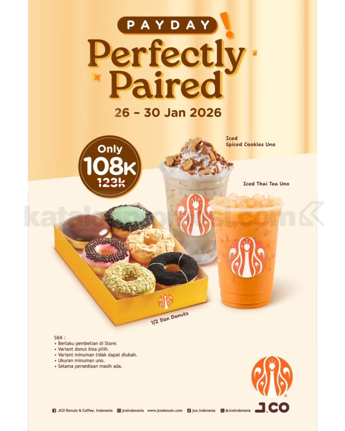 Promo JCO Payday Treats Rp. 108.000 nikmati 1/2 lusin donuts plus 2 minuman segar dalam satu paket, berlaku mulai tanggal 26 Januari 2026 – 30 Januari 2026 di seluruh store JCO Indonesia.