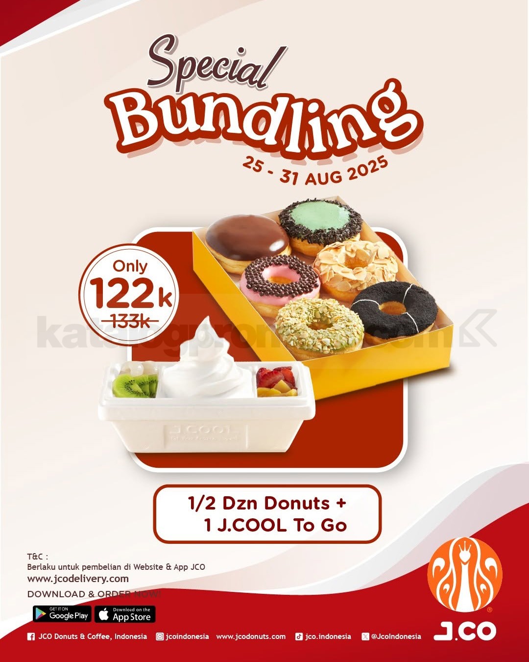 Buat kamu yang lebih suka pesan via online, ada juga bundling spesial di JCO App & Website Delivery. Paket manis ini terdiri dari 1 JCOOL To Go + 1/2 Lusin Donuts seharga Rp122.000. Kamu bisa pilih antar ke rumah atau pick up di store terdekat. Berlaku pada 25 – 31 Agustus 2025.
