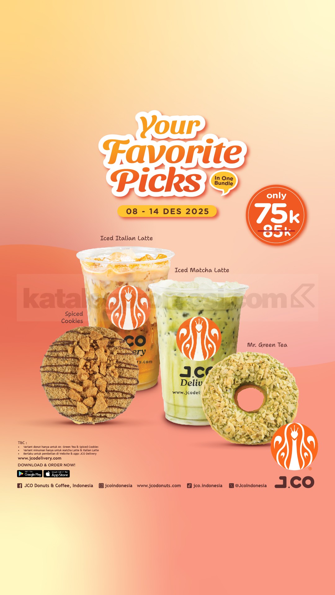 Promo JCO Your Favorite Picks In One Bundle Rp.75.000, nikmati 2 minuman + 2 Donuts, berlaku 8–14 Desember 2025 via JCO App & Website Delivery.