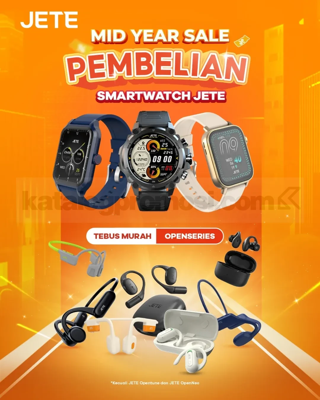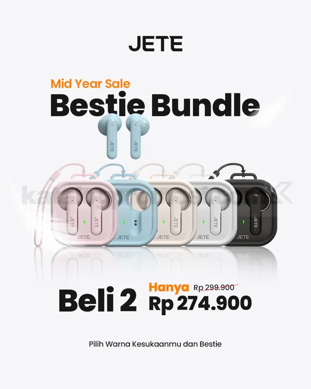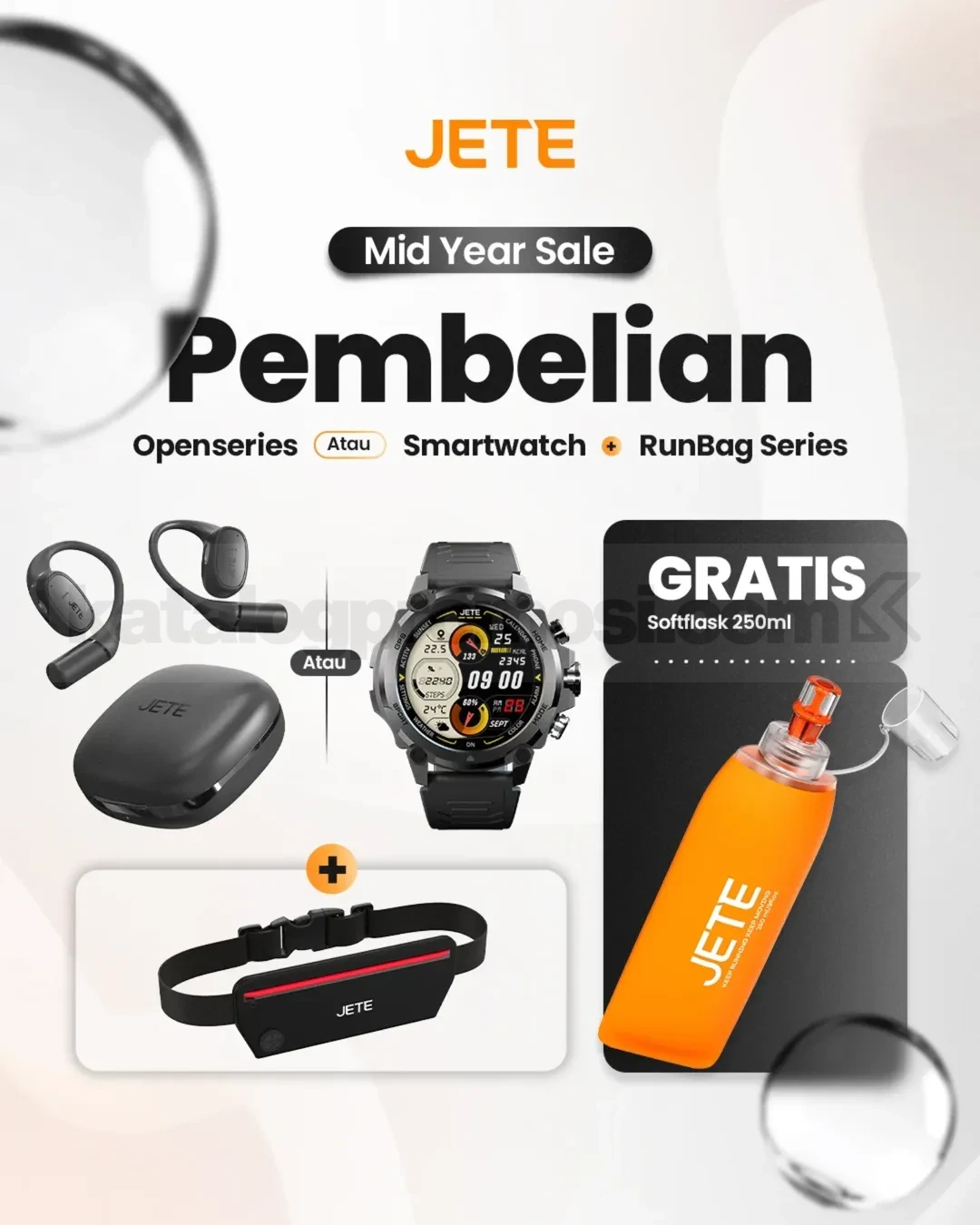 Langsung ke JETE Official Store atau Doran Gadget Store, nikmatin Promo Mid Year Sale JETE Indonesia, upgrade gaya & dapetin bonus menarik sebelum promonya selesai 30 Juni 2025!