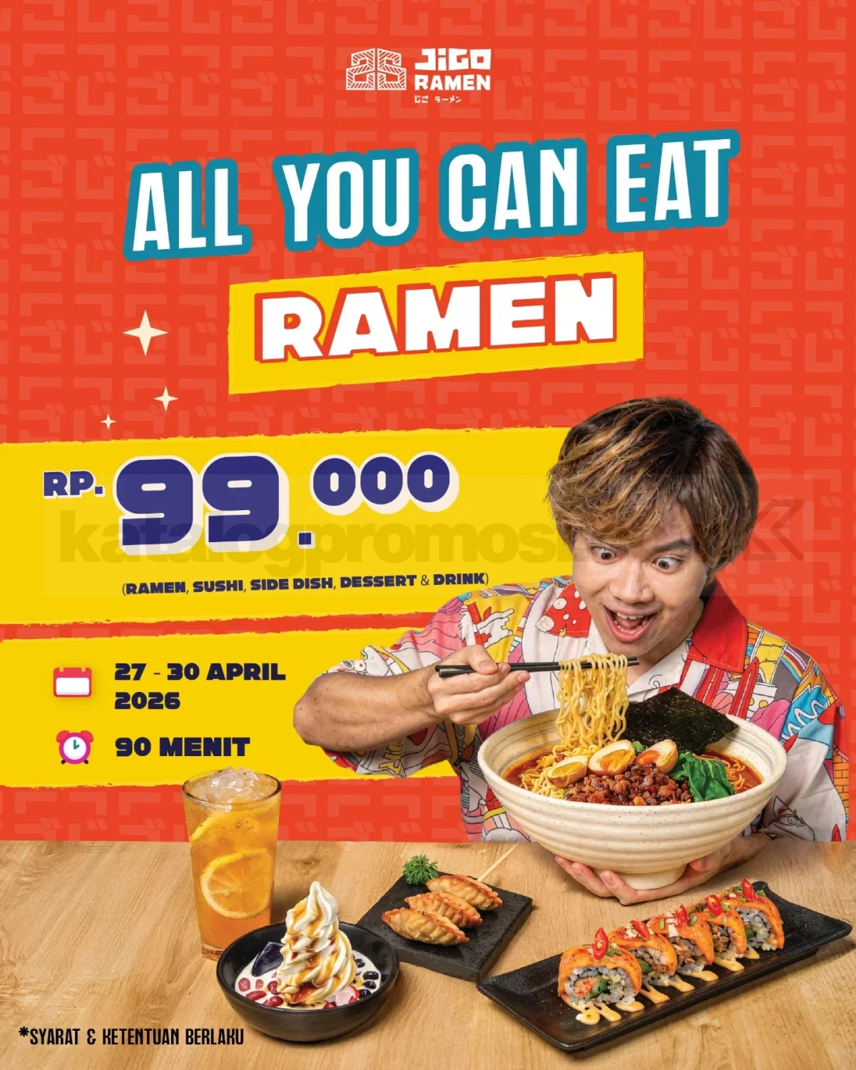 Promo Jigo Ramen All You Can Eat Rp. 99.000 nikmati ramen, sushi, dan dessert sepuasnya dalam 90 menit berlaku mulai tanggal 27 April 2026 – 30 April 2026 di Medan.