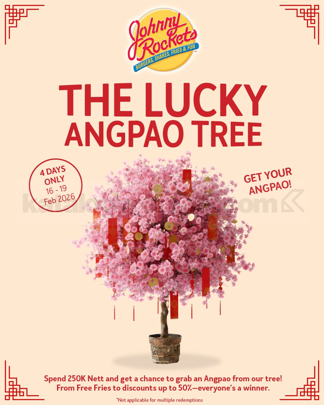 Promo Johnny Rockets Imlek The Lucky Angpao Tree berlaku tanggal 16 β 19 Februari 2026 dengan kesempatan ambil angpao setelah belanja Rp. 250.000 nett