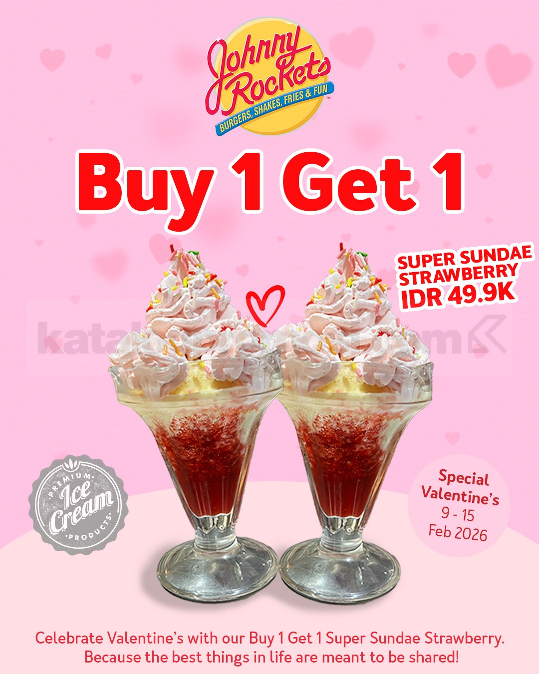 Promo Johnny Rockets Valentine Buy 1 Get 1 Free Super Sundae Strawberry Rp. 49.900 berlaku tanggal 9 β 15 Februari 2026