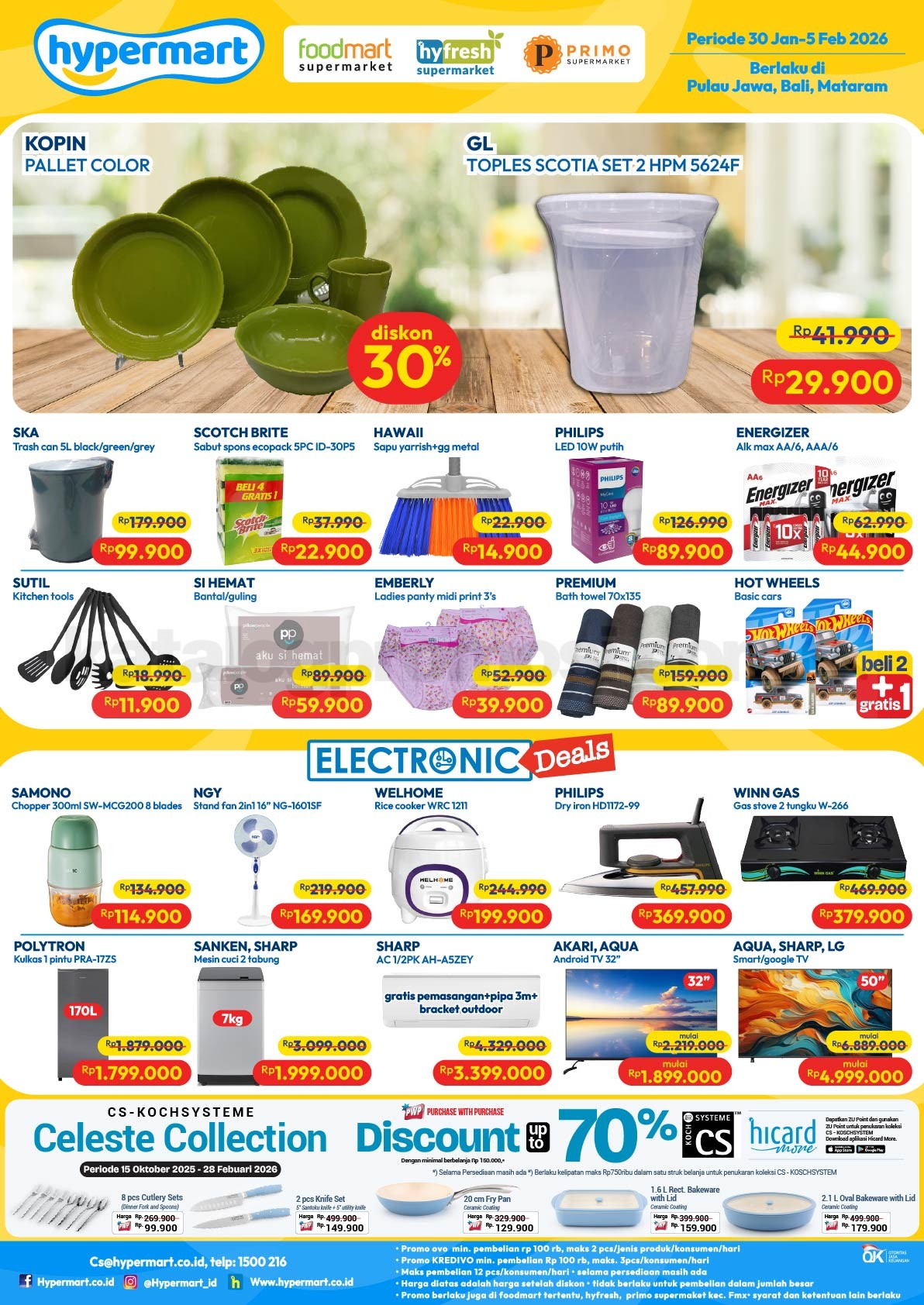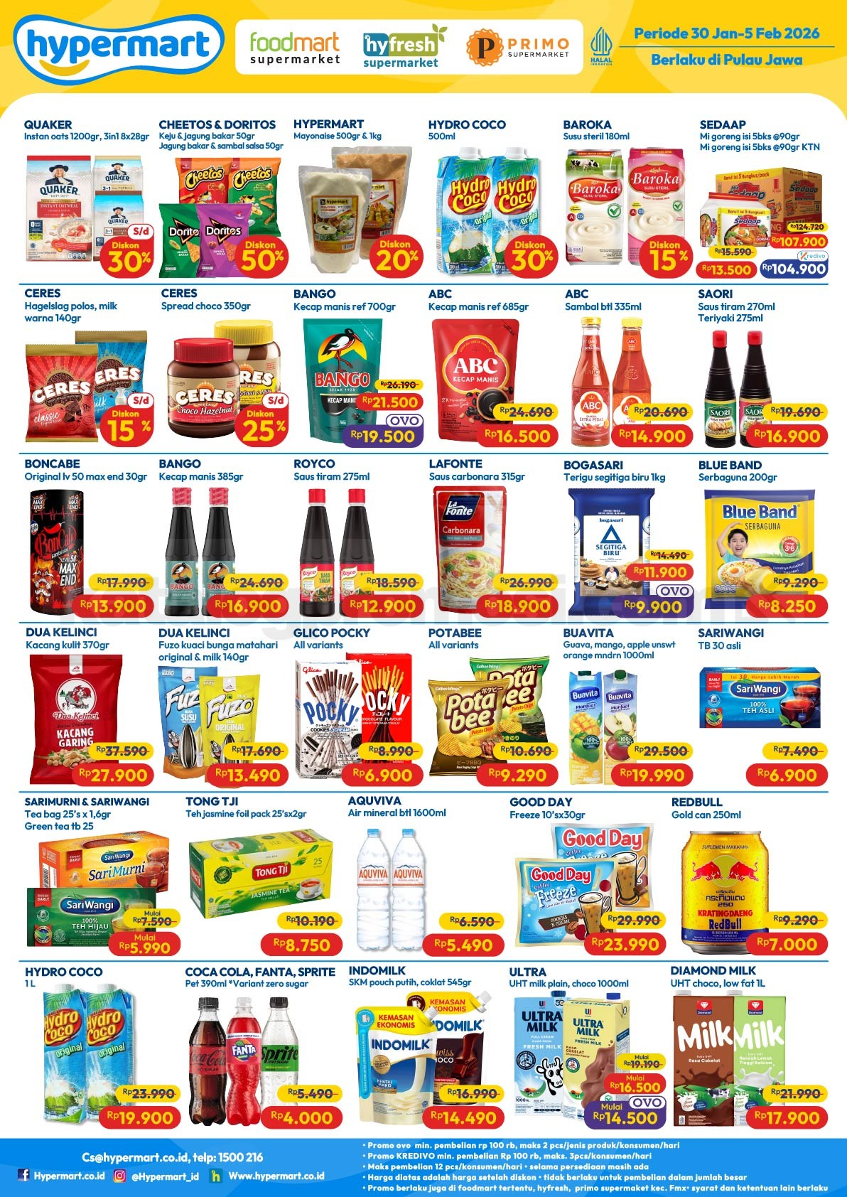 Minggu ini, saatnya belanja hemat dengan Promo JSM Hypermart periode 30 Januari – 05 Februari 2026! Buat kamu yang tinggal di Pulau Jawa, ada berbagai produk kebutuhan harian dan elektronik yang lagi diskon besar-besaran, Mulai dari produk segar, peralatan rumah tangga, minyak goreng, hingga produk elektronik, semuanya lagi turun harga khusus untuk kamu. Buat yang ingin lebih praktis, kamu bisa memanfaatkan layanan belanja online dari Hypermart, biar belanjaan sampai langsung ke rumah tanpa repot.